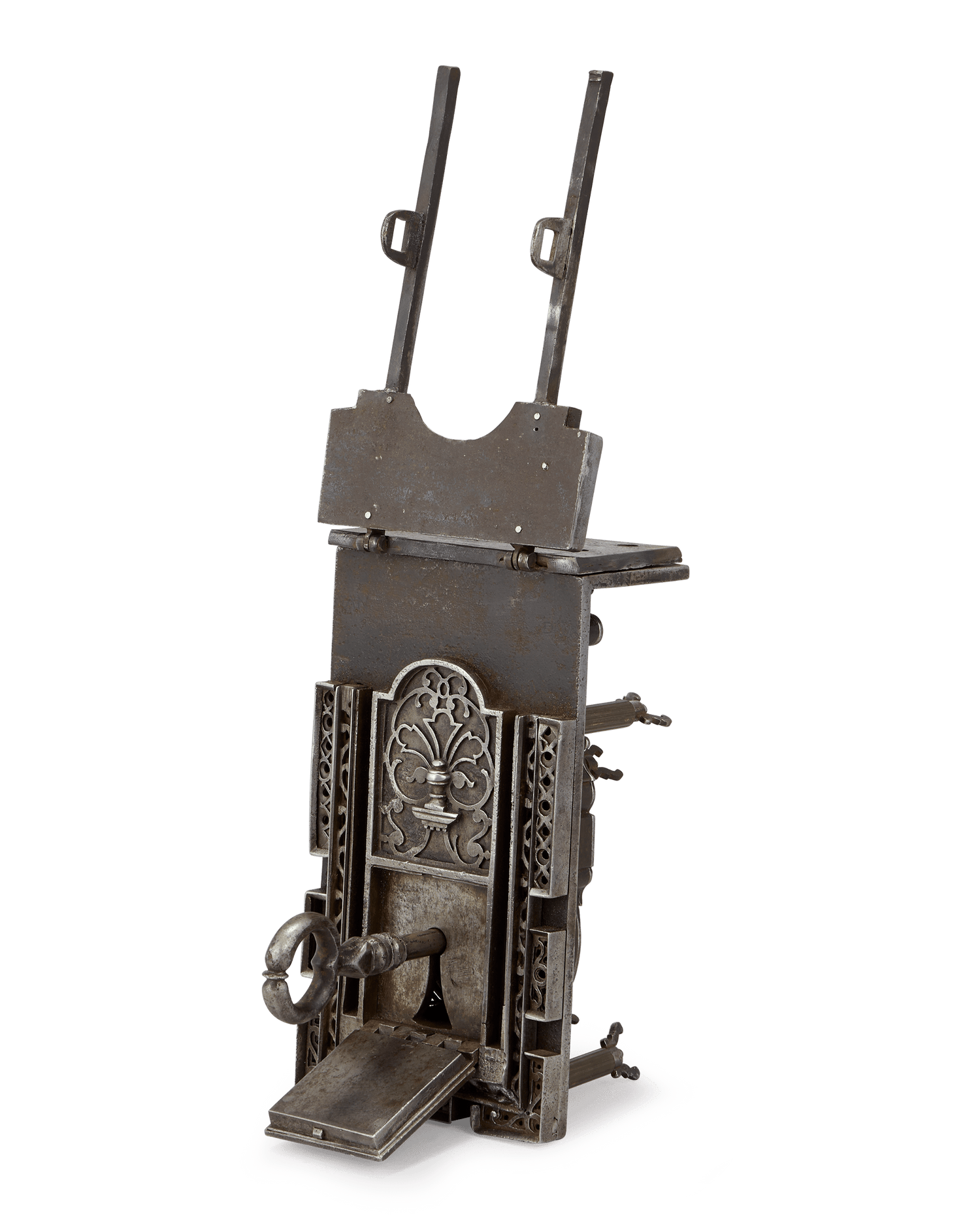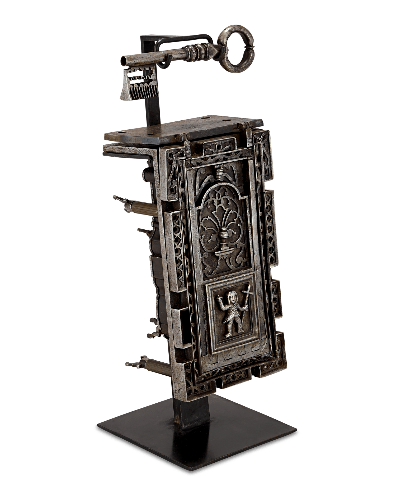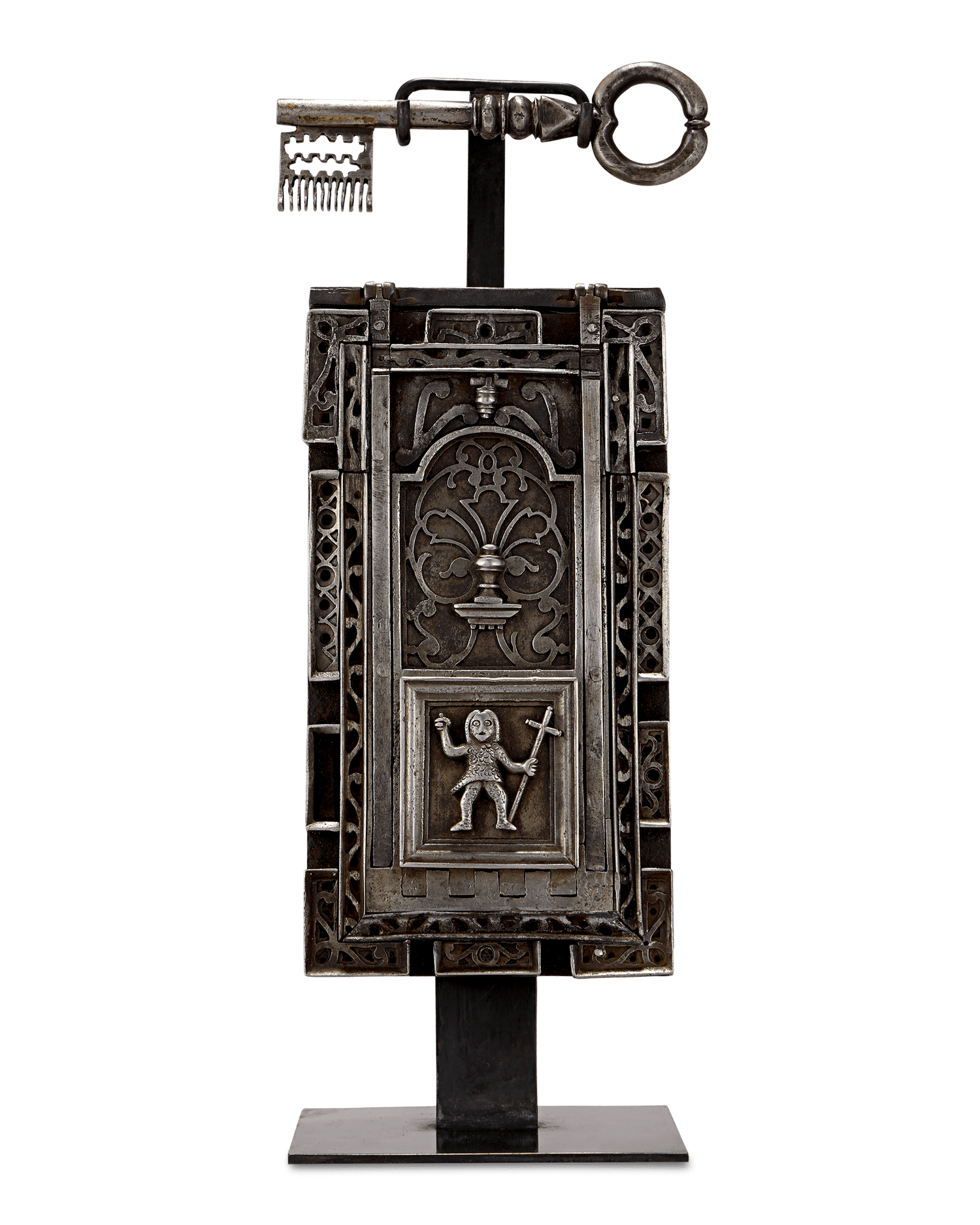 Ingeniously crafted with a hidden mechanism, this 18th-century French lock, known as a serrure de maîtrise, or master’s lock, was likely used by safemakers to demonstrate their locking systems to discerning clients. Before commissioning a costly safe, buyers could inspect such examples to evaluate the mechanism’s complexity, security and craftsmanship. This example could also be installed within a door or gate. These locks are exceedingly rare, as a single master model often served as the inspiration for dozens of production safes.