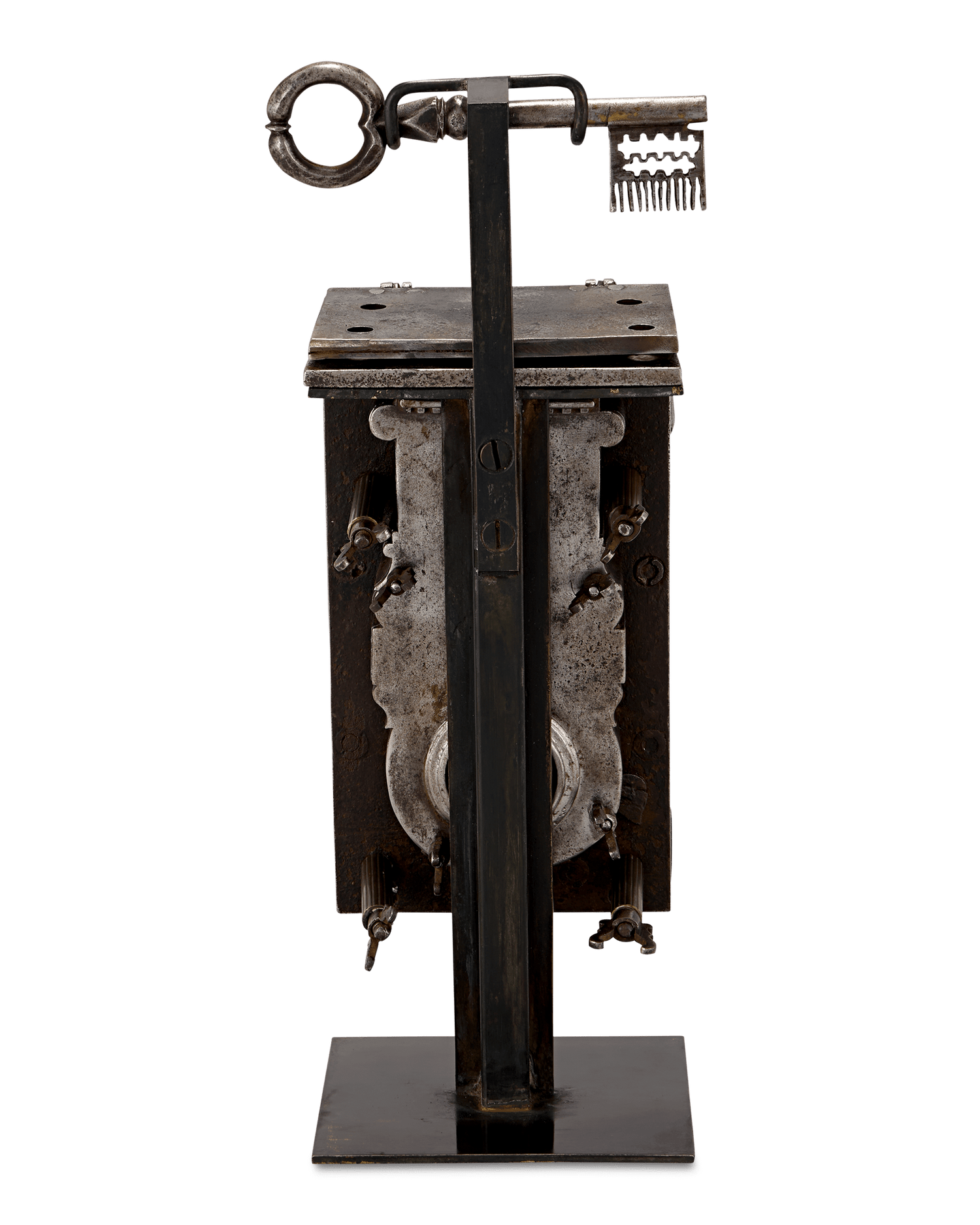 Ingeniously crafted with a hidden mechanism, this 18th-century French lock, known as a serrure de maîtrise, or master’s lock, was likely used by safemakers to demonstrate their locking systems to discerning clients. Before commissioning a costly safe, buyers could inspect such examples to evaluate the mechanism’s complexity, security and craftsmanship. This example could also be installed within a door or gate. These locks are exceedingly rare, as a single. . .