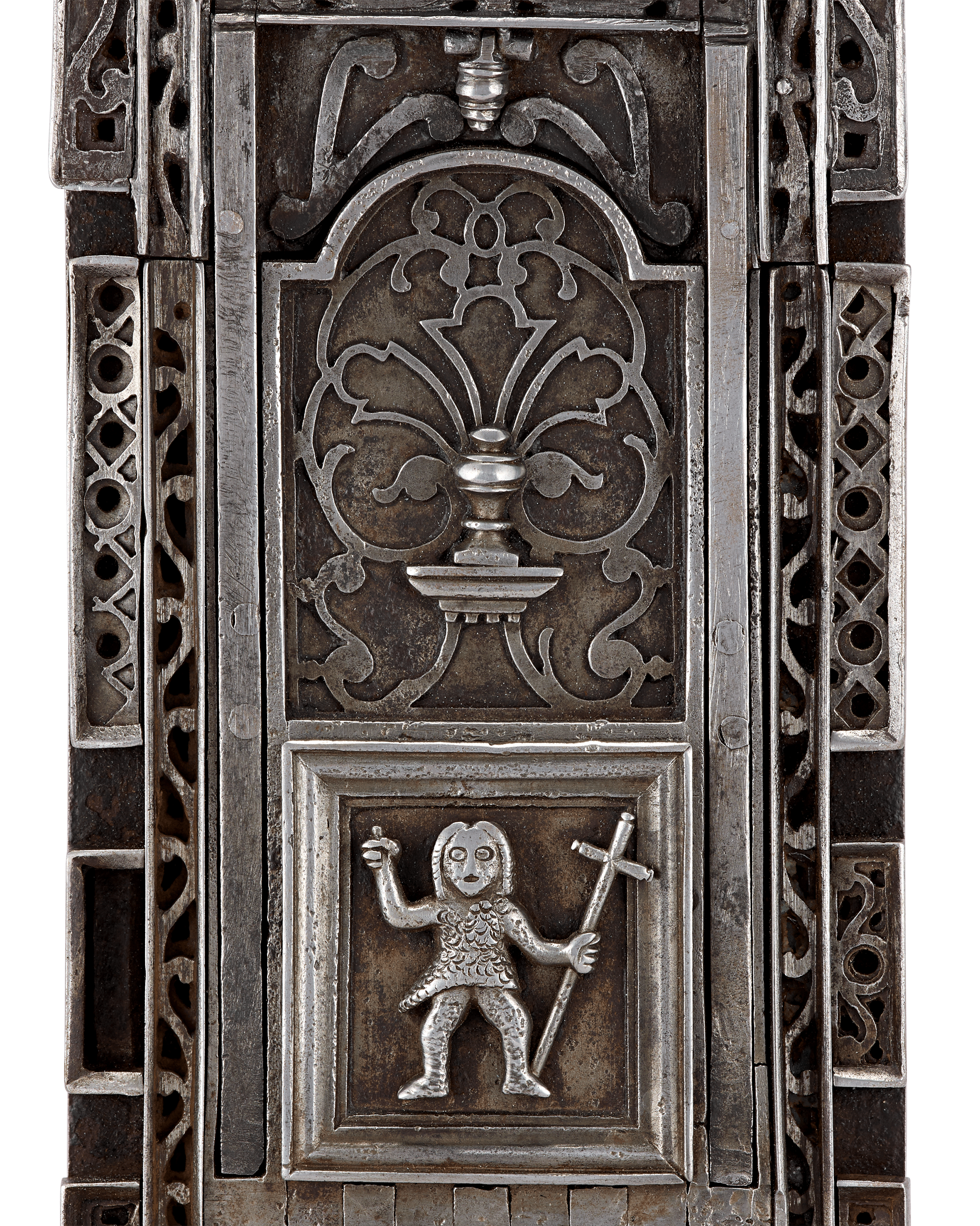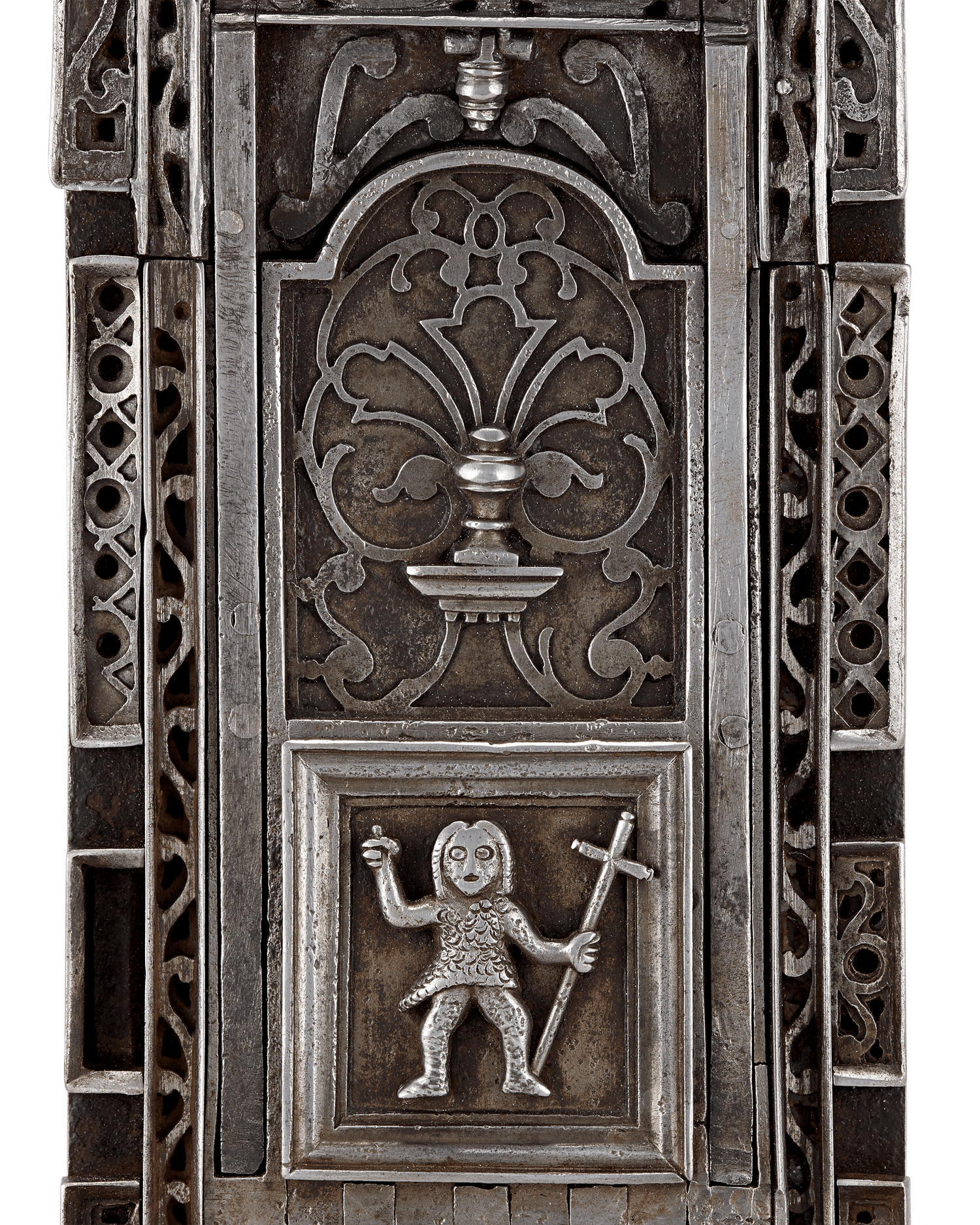 This particular example is especially remarkable. The mechanism includes a concealed keyhole and comes complete with its original key, which is as artful as it is functional, with no detail left unembellished. The lock’s construction reveals the exceptional ingenuity of French locksmiths, with exquisitely detailed scrollwork and a knightly figure bearing a cross adorning the surface. Both visually arresting and mechanically sophisticated, this piece is a testament to the elegance and security that defined 18th-century French ironwork.