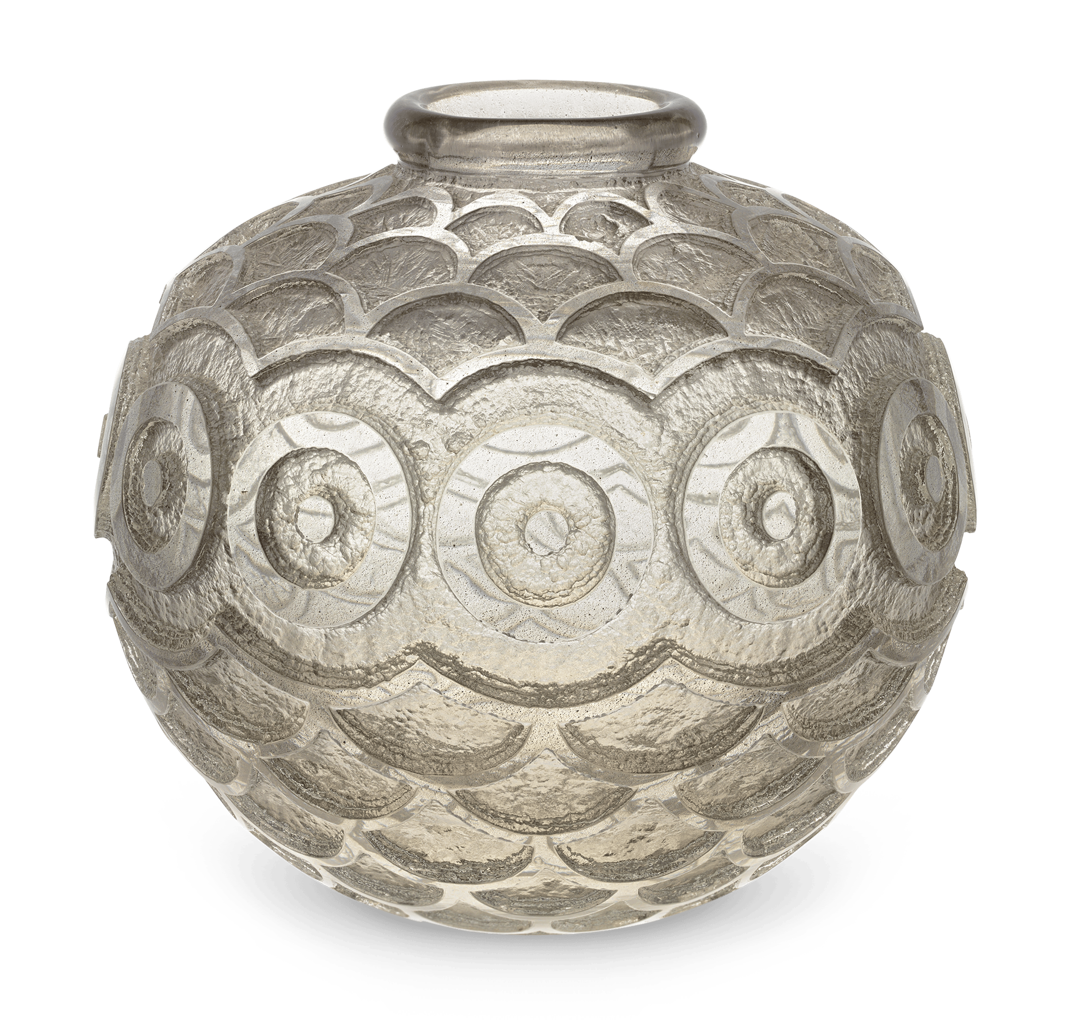 This rare and striking Art Deco vase by Daum Nancy represents the pinnacle of French craftsmanship. The spherical form is adorned with deeply acid-etched geometric circles that encircle the work in a harmonious blend of shape and design. This captivating motif encapsulates the period's celebration of modernity and abstraction in smokey glass. The deeply acid-etched decoration is a hallmark of Daum’s masterful technique.