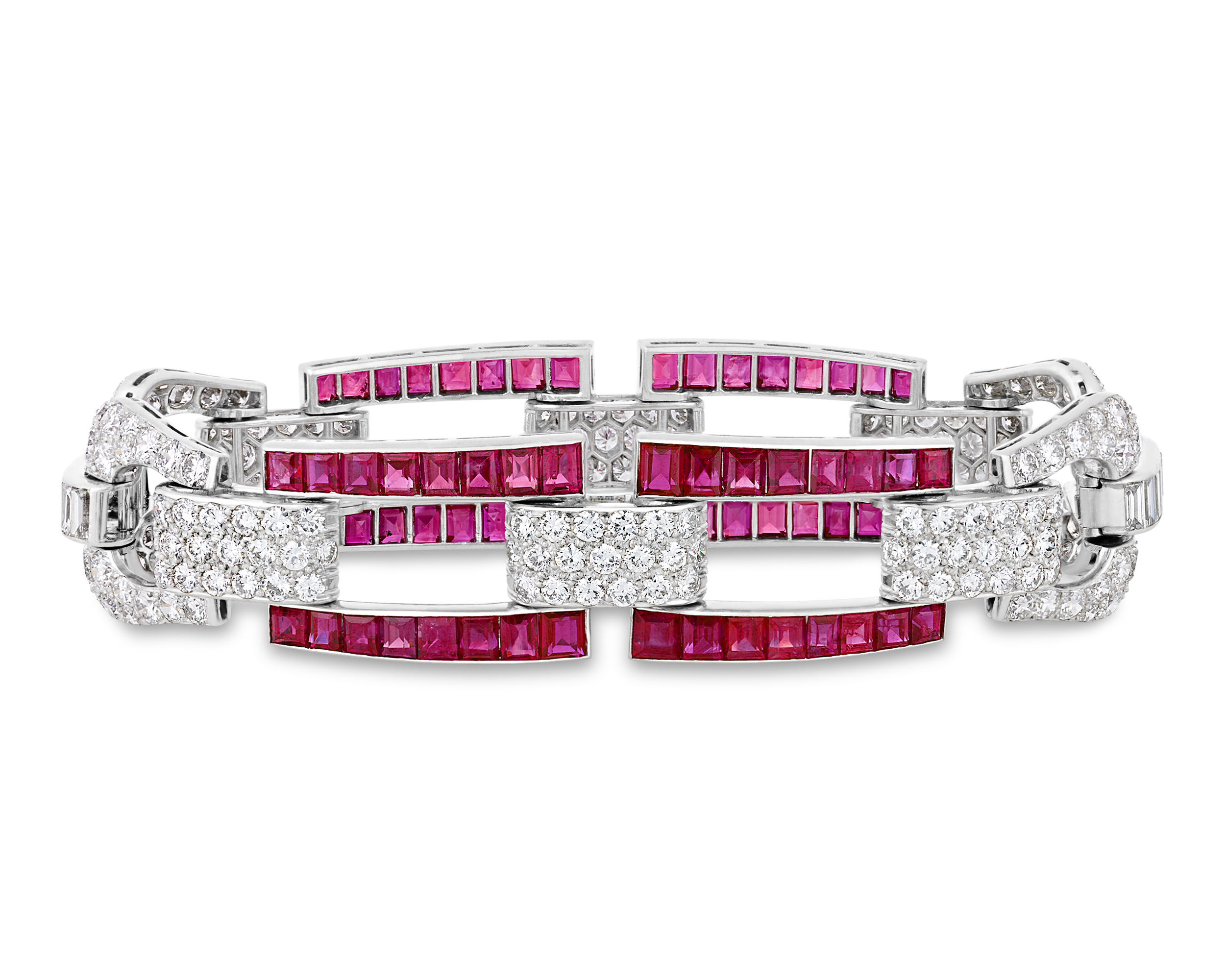 - Forming a linked design, this Art Deco-style bracelet has nearly 18.00 carats of Burma Rubies