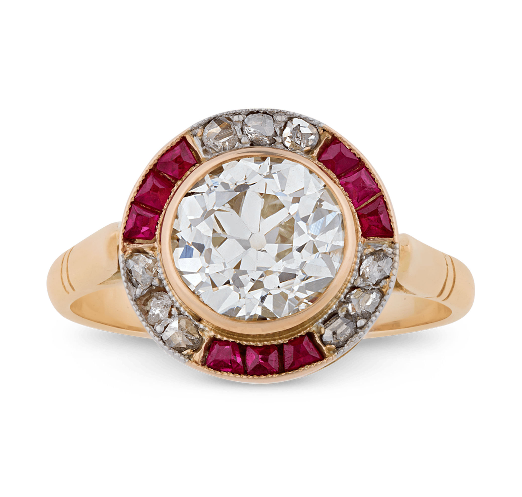 - Surrounding the diamond is a vibrant halo of rubies and diamonds