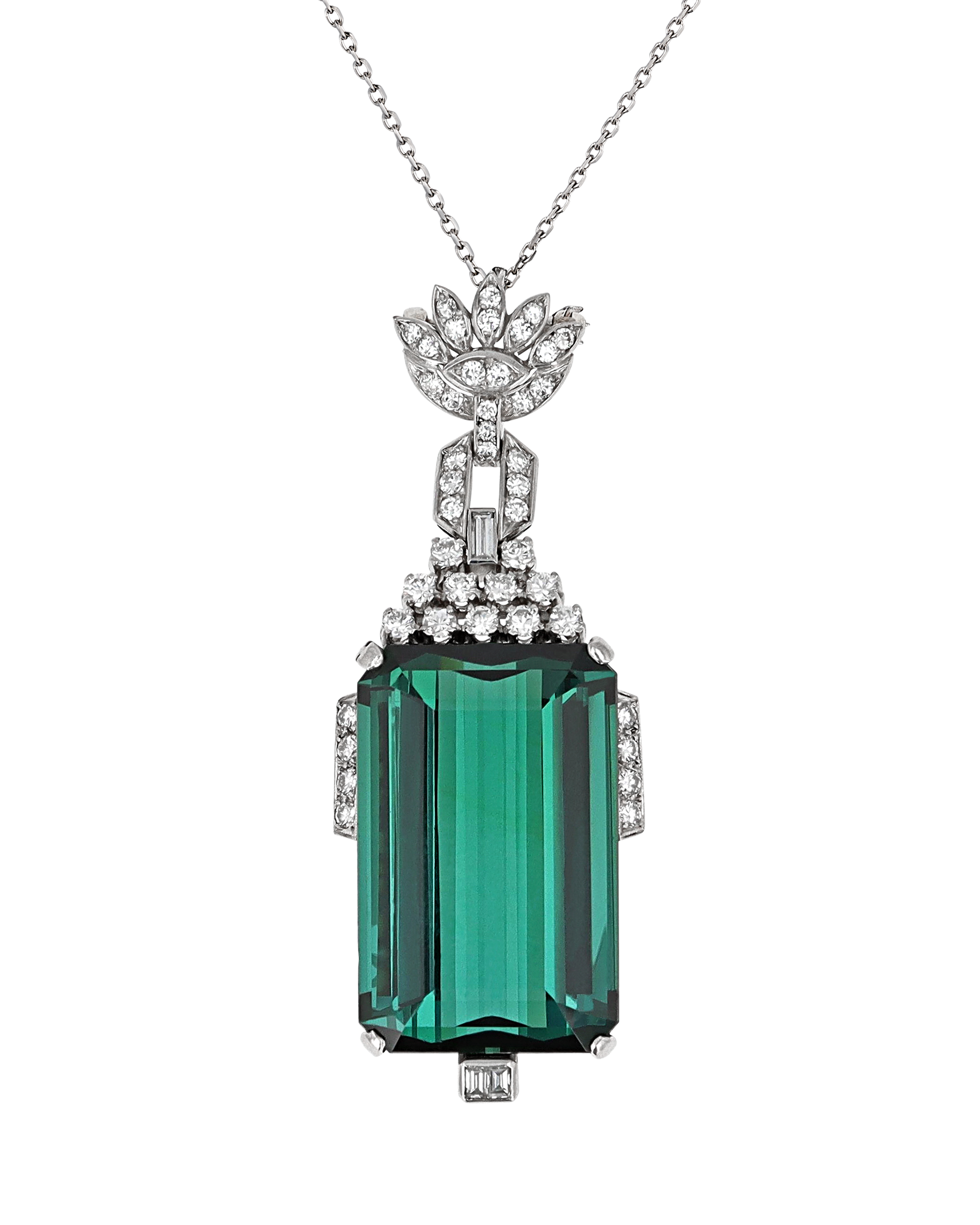 - This Art Deco-period pendant is set with an emerald-cut green tourmaline weighing 80.71 carats