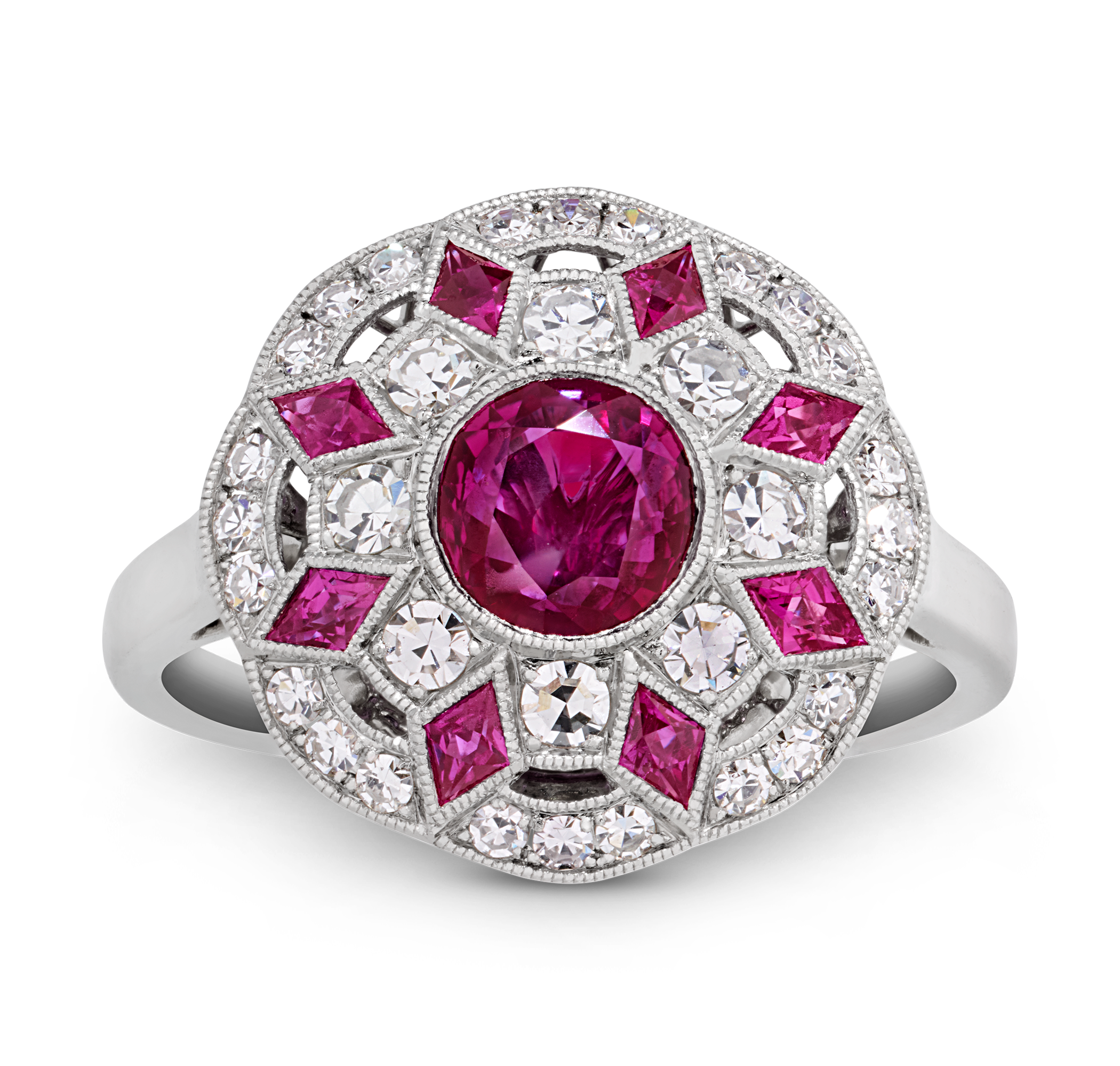 - A vibrant 1.29-carat ruby sparkles at the heart of this elegant Art Deco–style ring