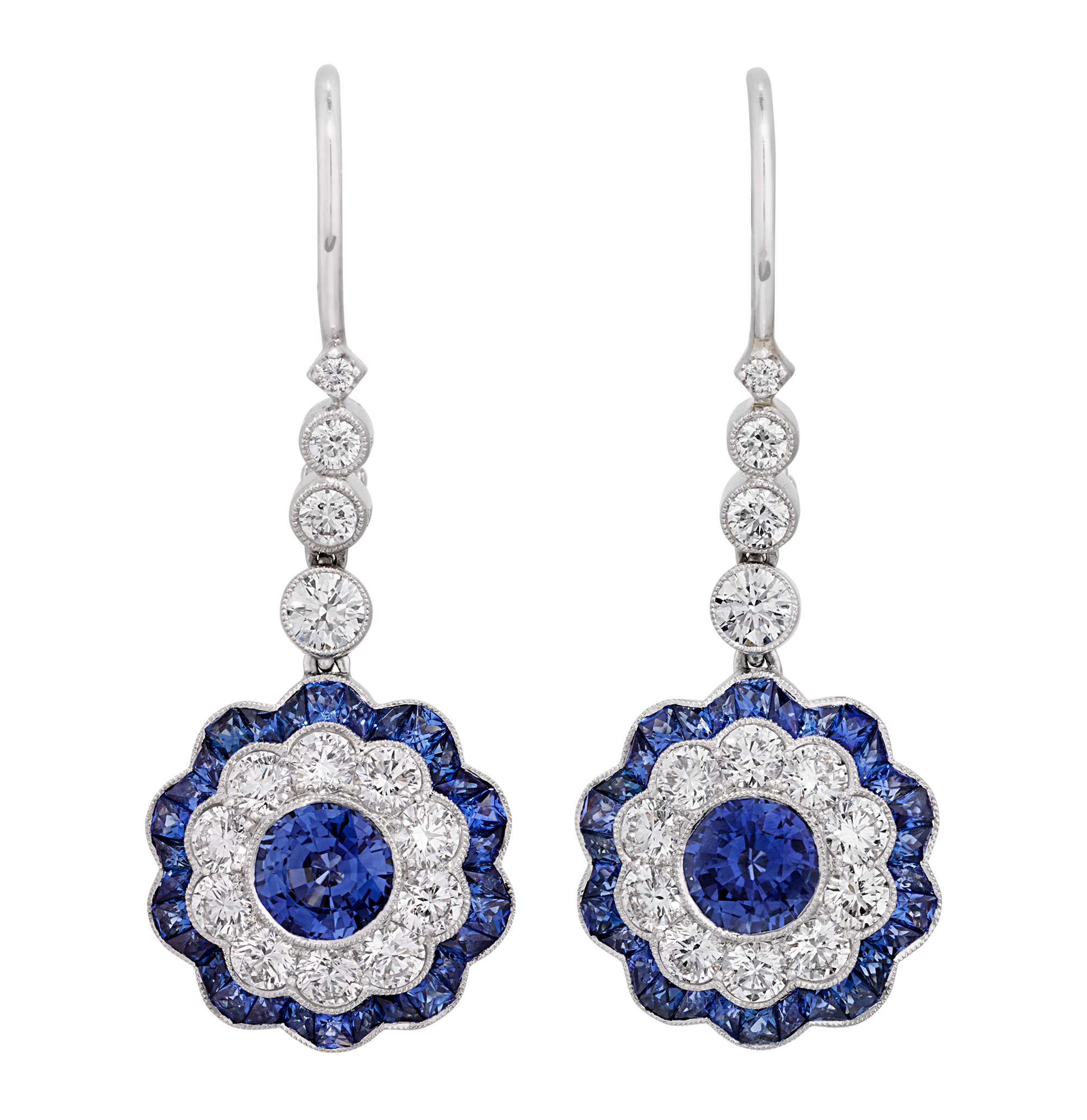 The design centers on richly hued sapphires of exceptional blue tone, surrounded by alternating tiers of sparkling diamonds and sapphires arranged in a precise scalloped motif. Crafted in platinum and 18K white gold, the composition reflects the symmetry and refined craftsmanship characteristic of 1920s design. Each earring suspends elegantly from a graduated line of bezel set diamonds, offering graceful movement and timeless sophistication.