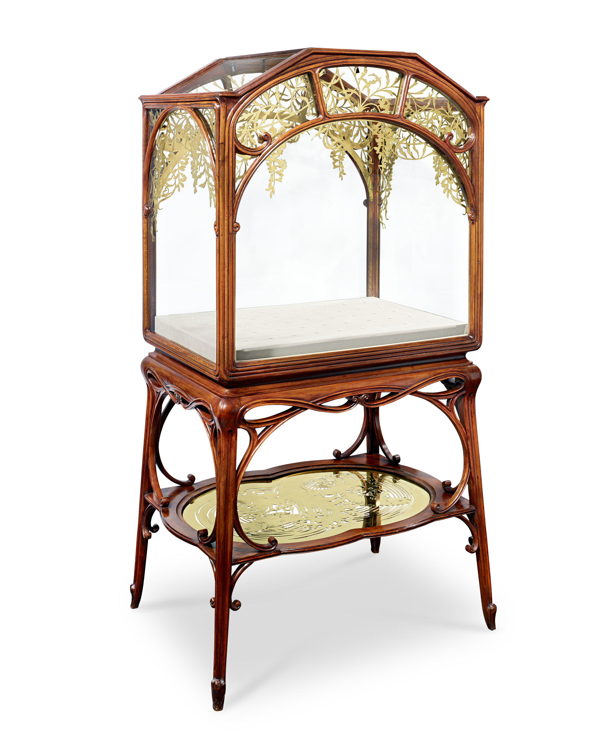 This extraordinary Art Nouveau display cabinet, conceived under the direction of renowned French decorator Georges Hoentschel, is a singular work of art created for display at the 1902 Salon of the Société Nationale des Beaux-Arts. Uniting curvilinear structure and delicate natural motifs, the masterpiece presents as an indoor greenhouse, beautifully rendered in sculpted, ribbed and stained plane tree with glazed upper panels and arching lines reminiscent of flowering branches. Its exceptional brass ornamentation and pierced base tray, executed by Frank Scheidecker, depicts cascading wisteria and koi fish, transforming the structure into a luminous, botanical tableau.