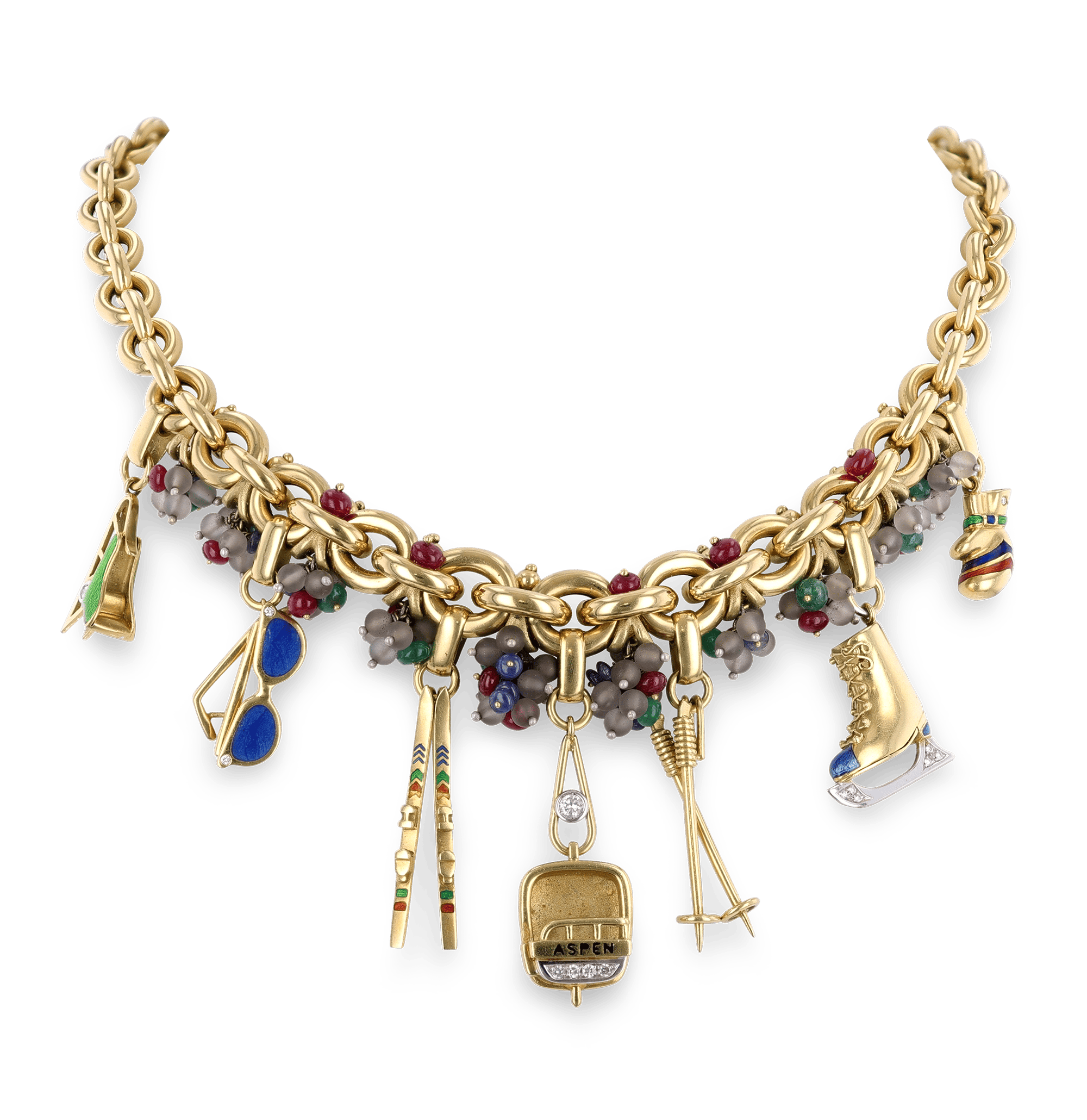 - The charms include a ski lift, skis, poles, sunglasses, an ice skate, a mitten and a sled