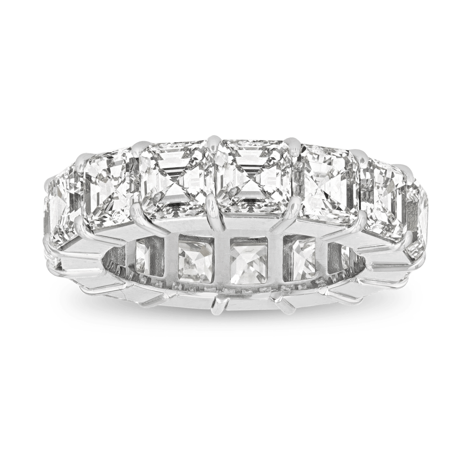 - Totaling 10.69 carats, this eternity band is made up of 15 sparkling Asscher-cut diamonds