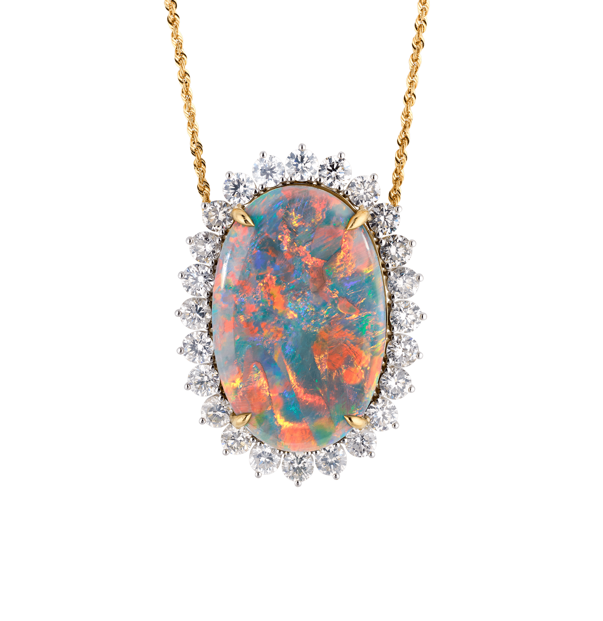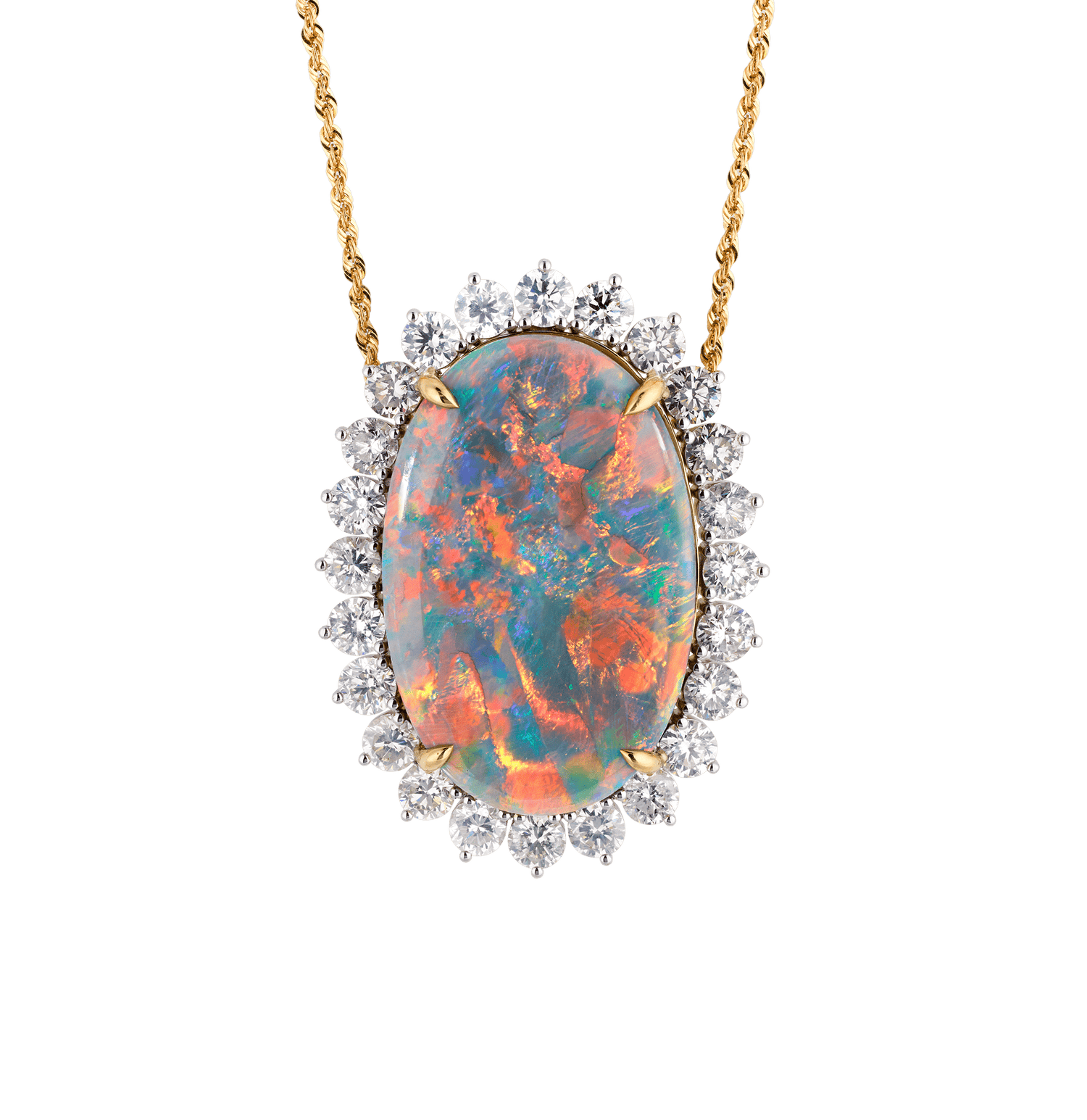 - This necklace features a monumental 51.54-carat Australian oval cabochon black opal pendant