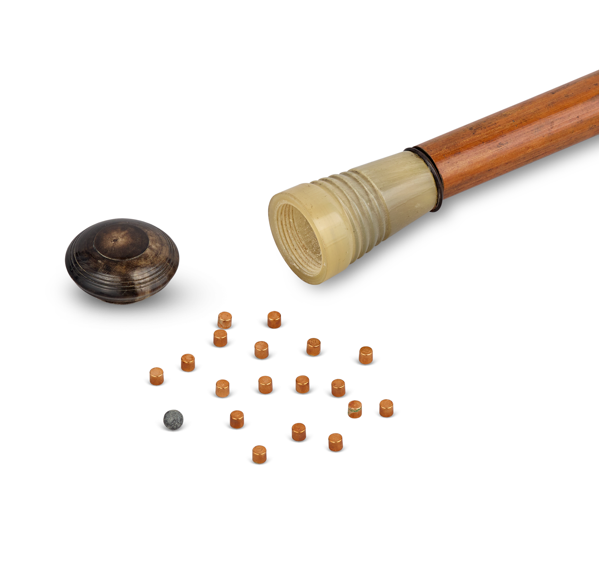 This unassuming walking stick transforms into a blowgun in the blink of an eye. The horn handle unscrews to reveal small pellets and a hollow shaft capable of projecting the objects at great velocity. An intriguing collectible, this classic cane would make a wonderful and unique addition to any collection of antique canes or weapons.