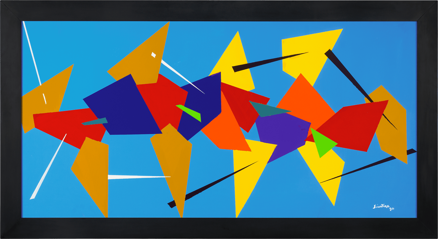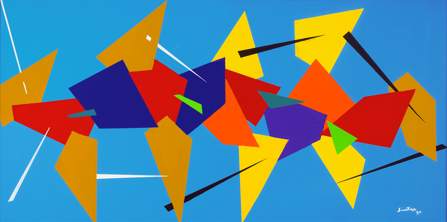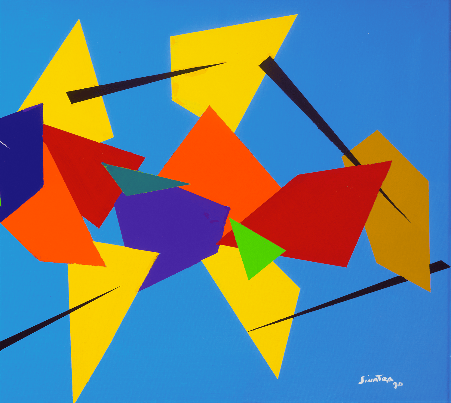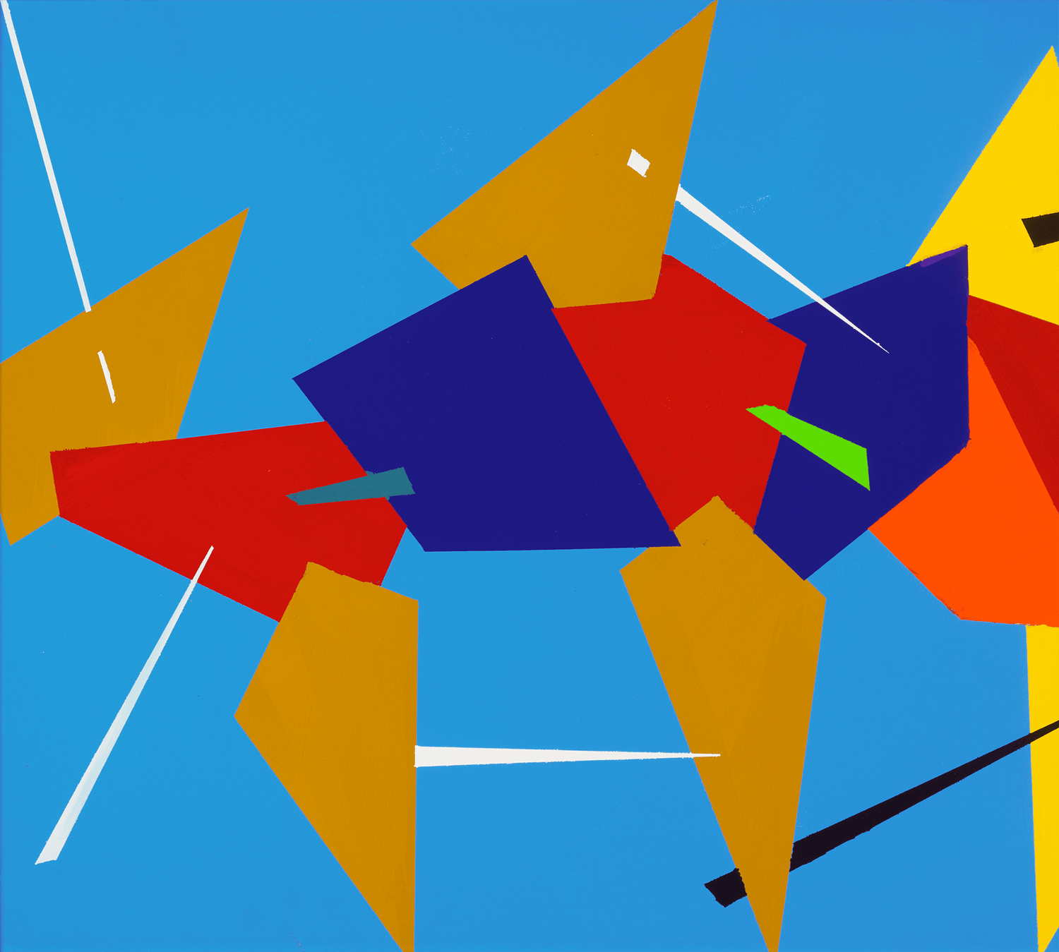- This energetic composition presents bold geometric forms and sharp lines in blue, red and orange