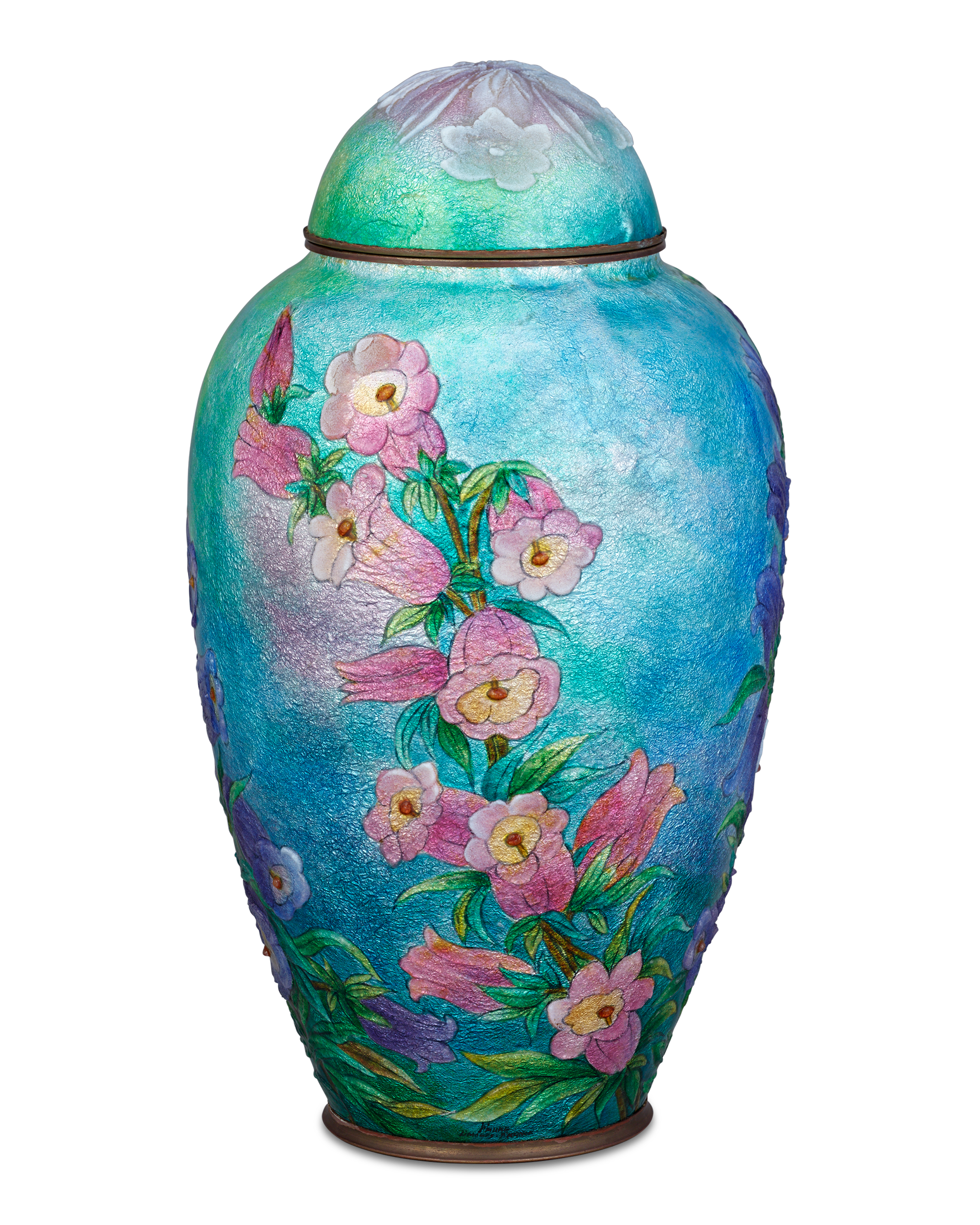 - Layers of enamel were applied to a copper vase form to achieve Fauré's signature built up look