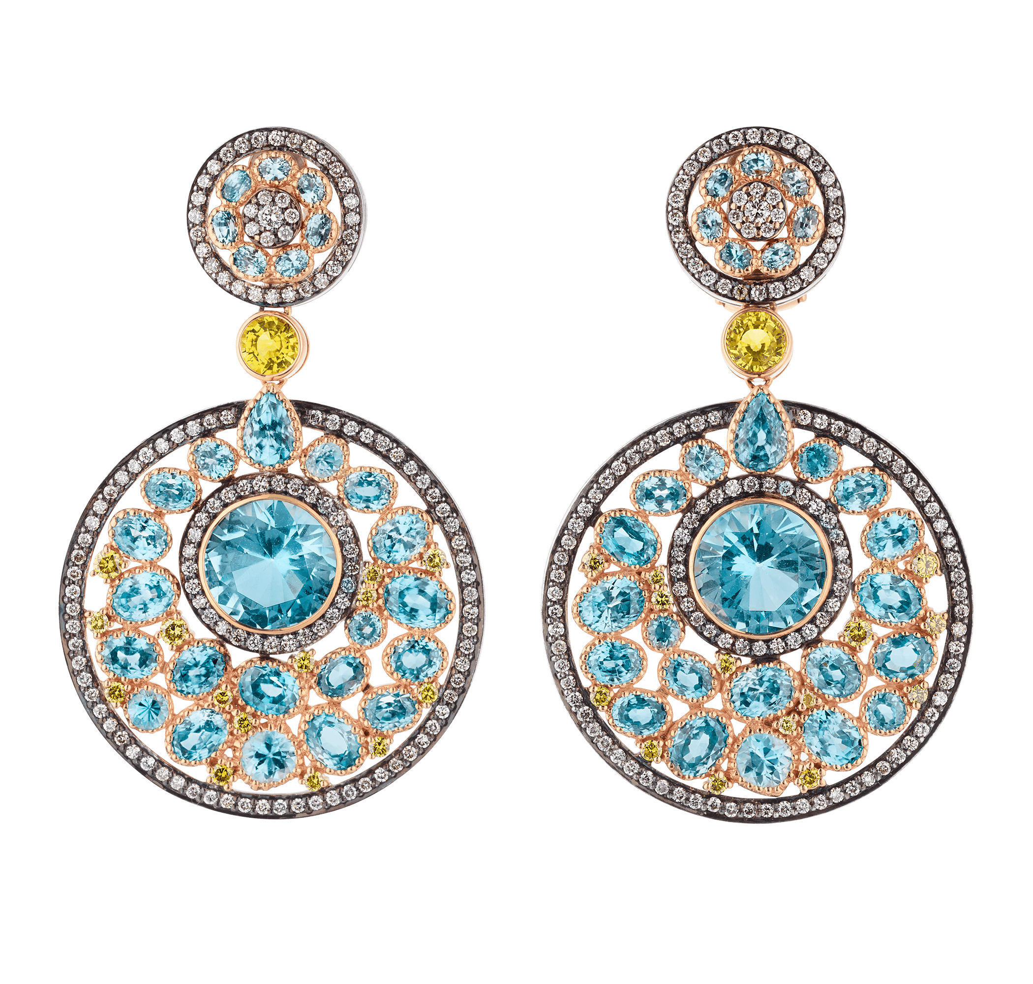 - Multiple tiers of circular medallions showcase oval, pear and round cut gemstones