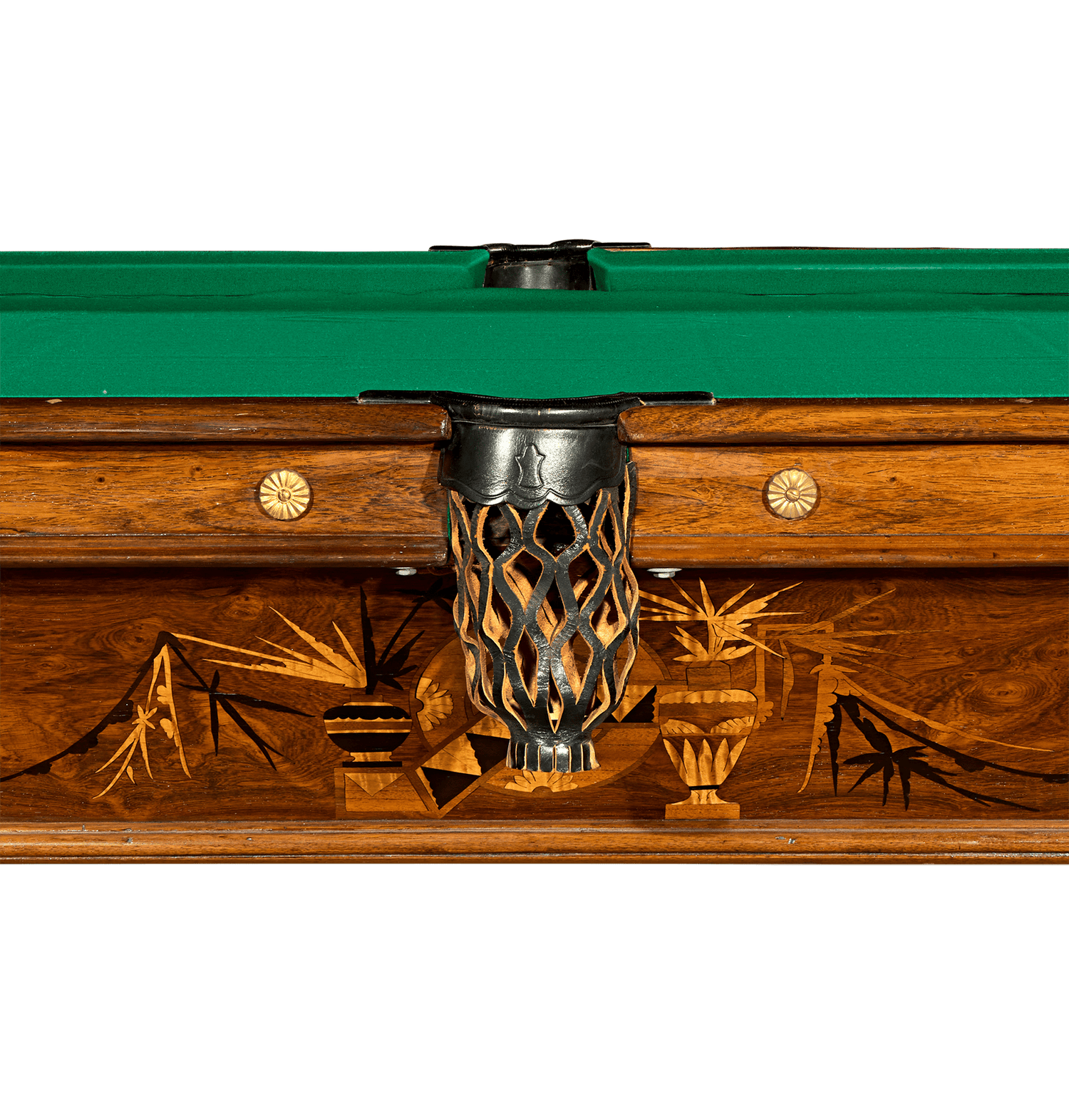 An outstanding example of early American craftsmanship, this pool table with Monarch cushions was crafted by the renowned Brunswick-Balke-Collender Co., the most iconic billiard table manufacturer in American history. Designed for pocket billiards, commonly known today as pool, this table represents the apex of quality and design during the golden age of billiards. The table showcases an extraordinary attention to detail, crafted from rosewood with rich wood inlay and robust, hand-turned legs.