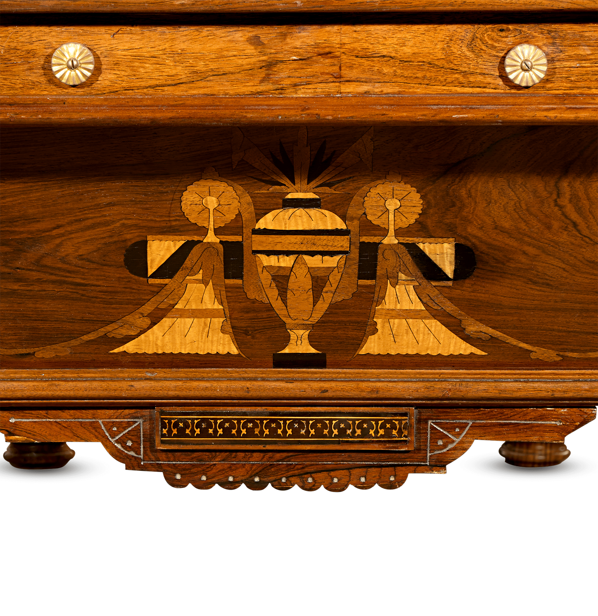 - The design is crafted from rosewood with rich wood inlay and robust, hand-turned legs