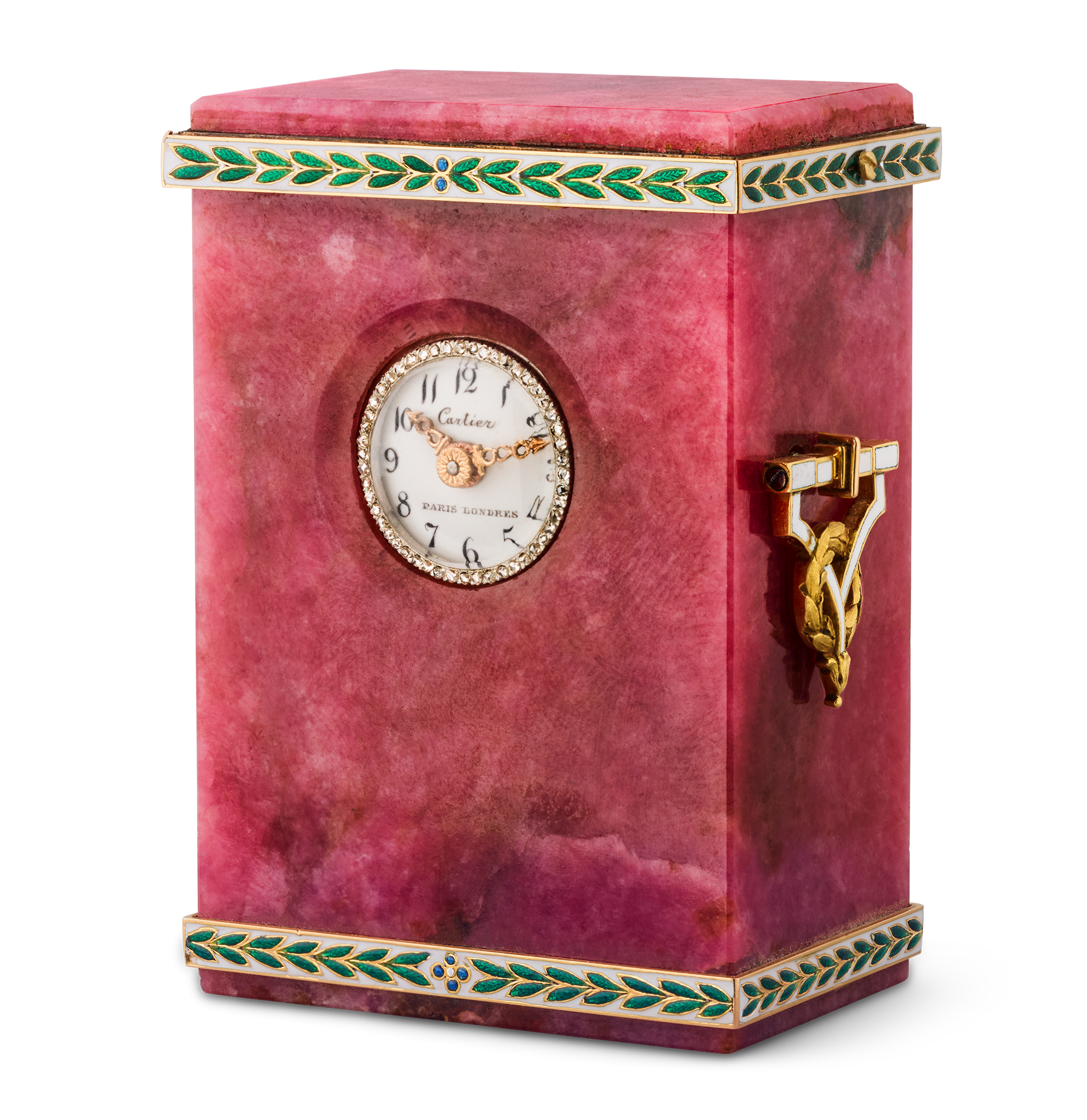 This exceptional Belle Époque boudoir clock by Cartier showcases the rare beauty of rhodonite paired with masterful craftsmanship in gold, platinum, diamonds and enamel. Its rose-red rhodonite body is accented by vivid green and blue enamel laurel motifs, a design motif gracefully echoed in the gilded handles. The white dial, with its black stylized Arabic numerals, is framed by a dazzling diamond-set bezel. These elements exemplify the refinement. . .