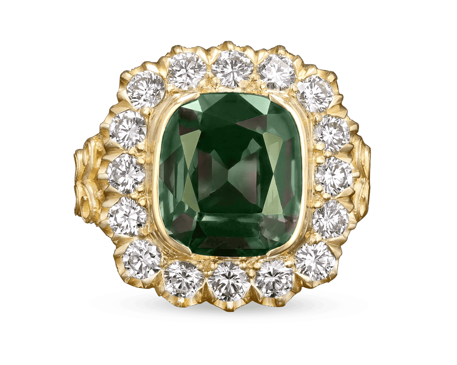 - The cushion cut stone is expertly set in 18K yellow gold by the renowned jeweler Cartier