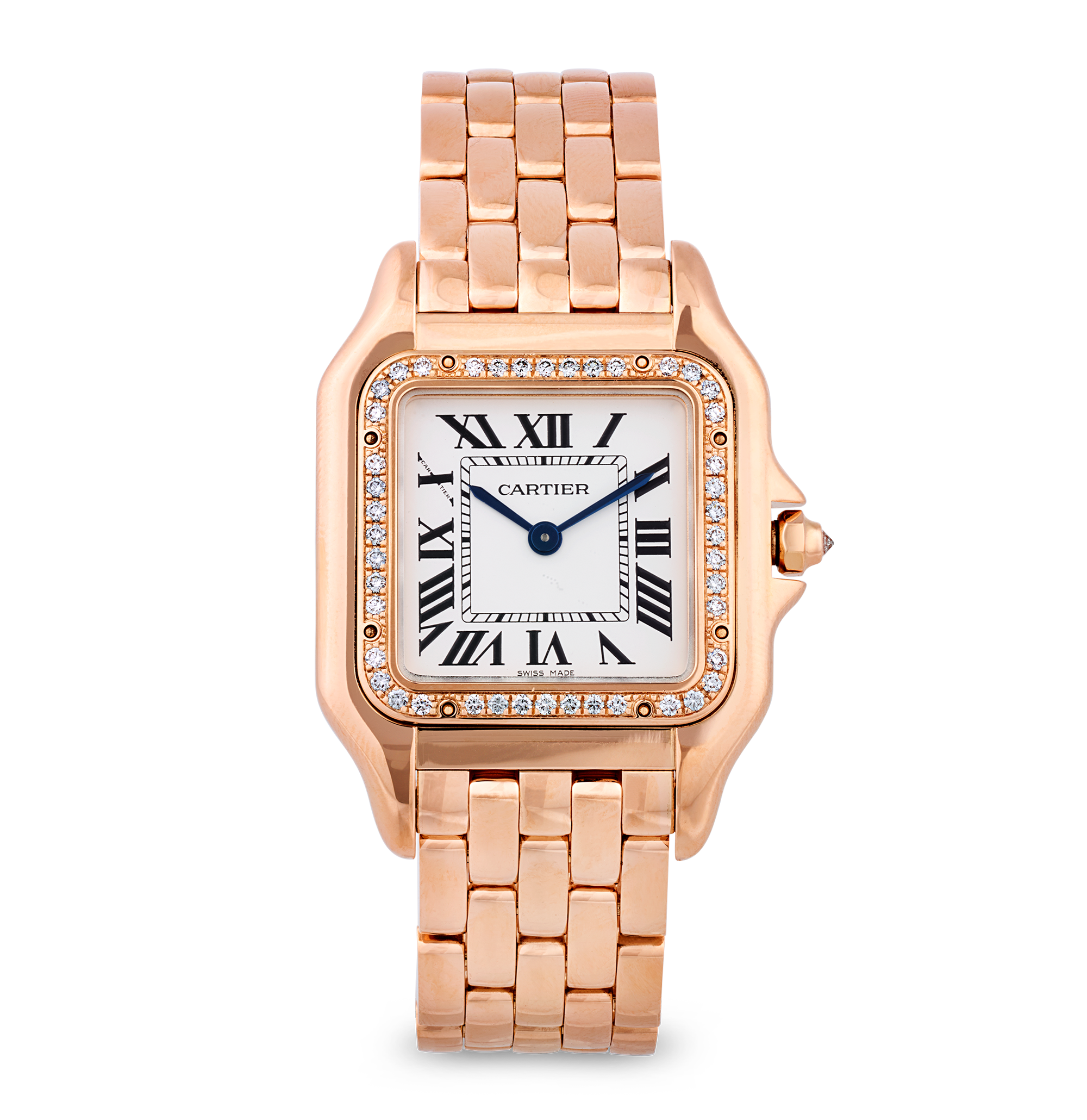 - This model showcases an 18K rose gold square case set with diamonds