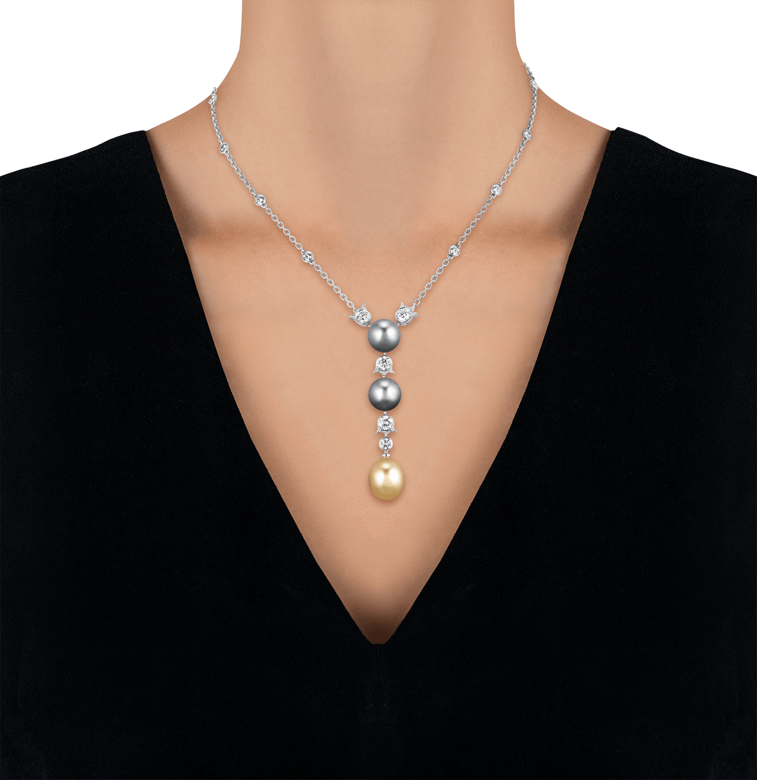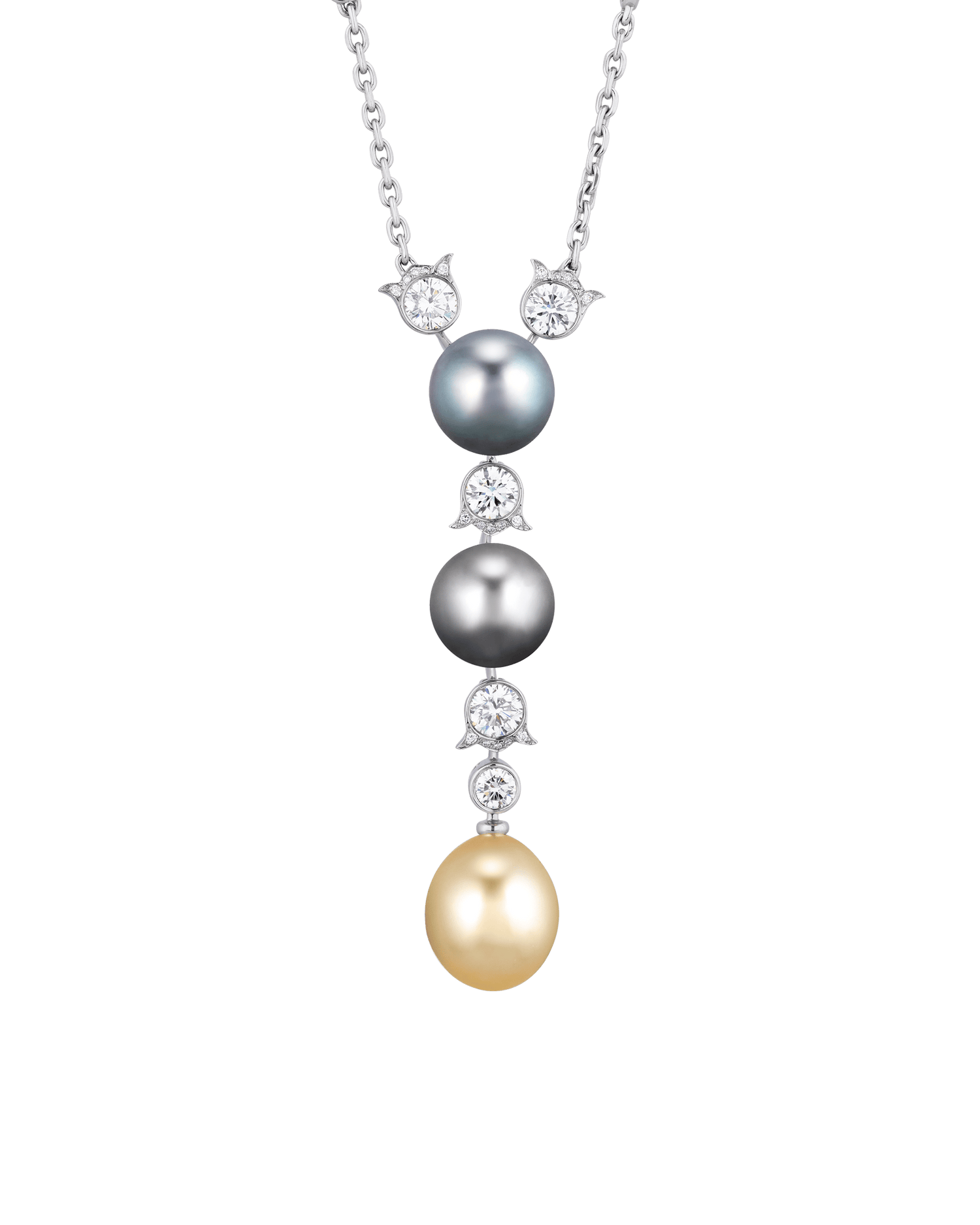 - The elegant pendant is formed from a rich golden drop pearl and two deep-toned Tahitian round pearls