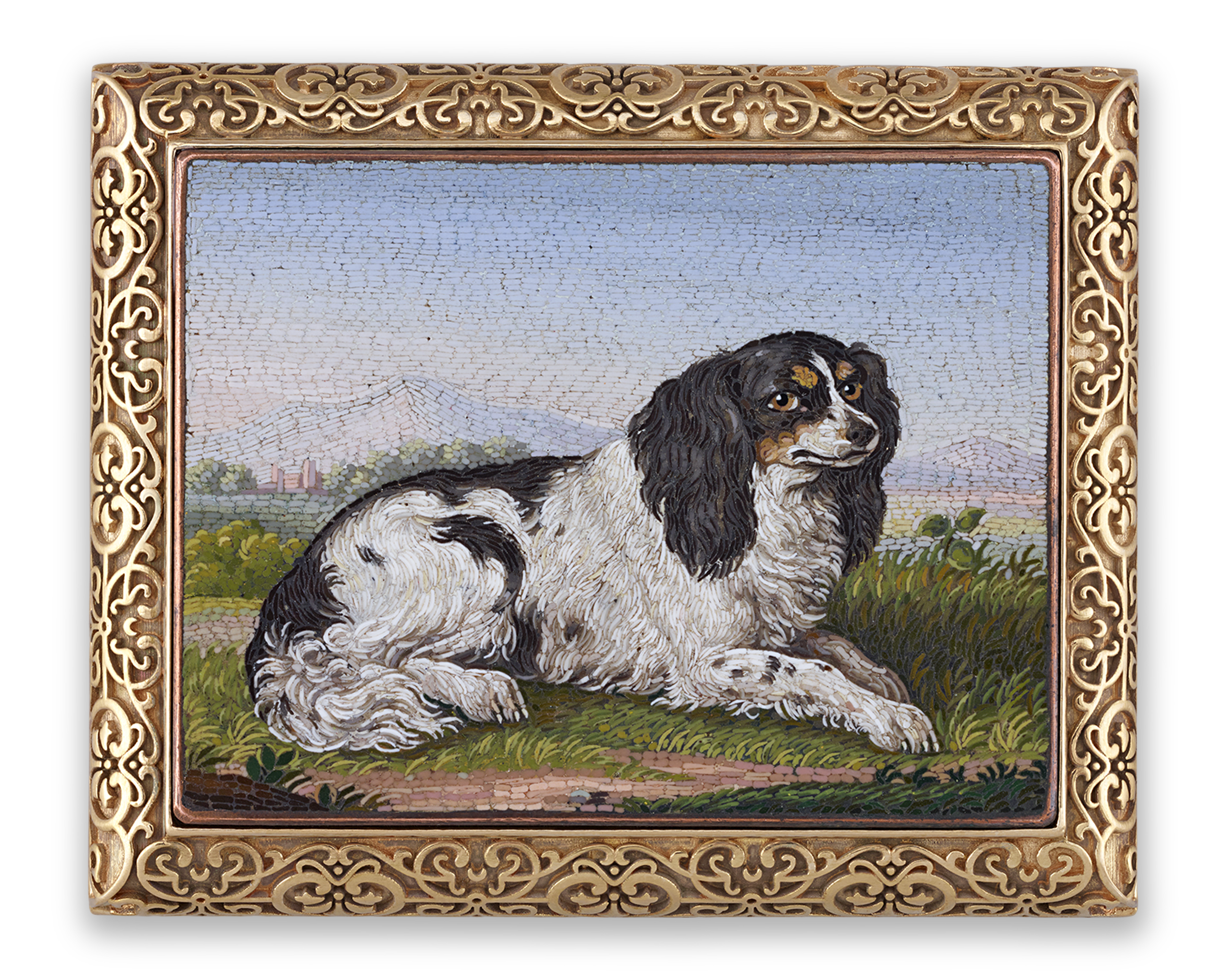 - A charming spaniel is depicted in this intricate micromosaic brooch