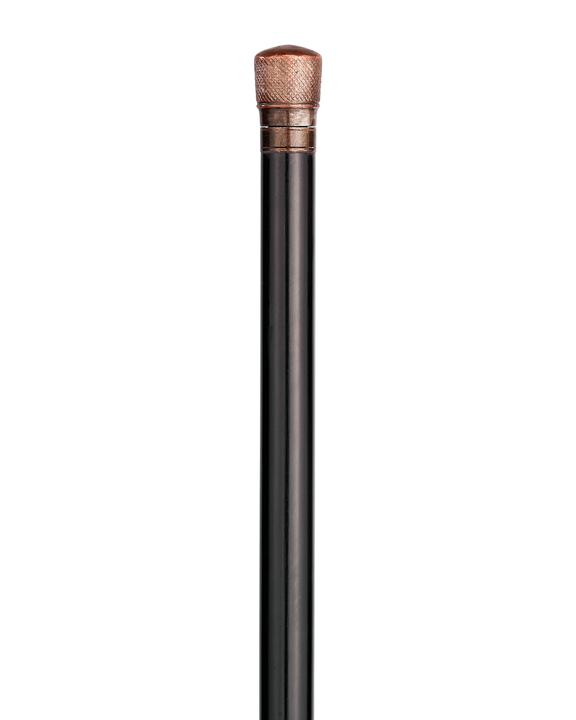 This decorative cane with a hidden compartment presents a textured copper handle that crowns an ebonized wood shaft, its surface cleverly designed to function as a match striker. The handle unscrews to reveal a discreet interior compartment, allowing small valuables or snuff to be stored with both elegance and subtlety.