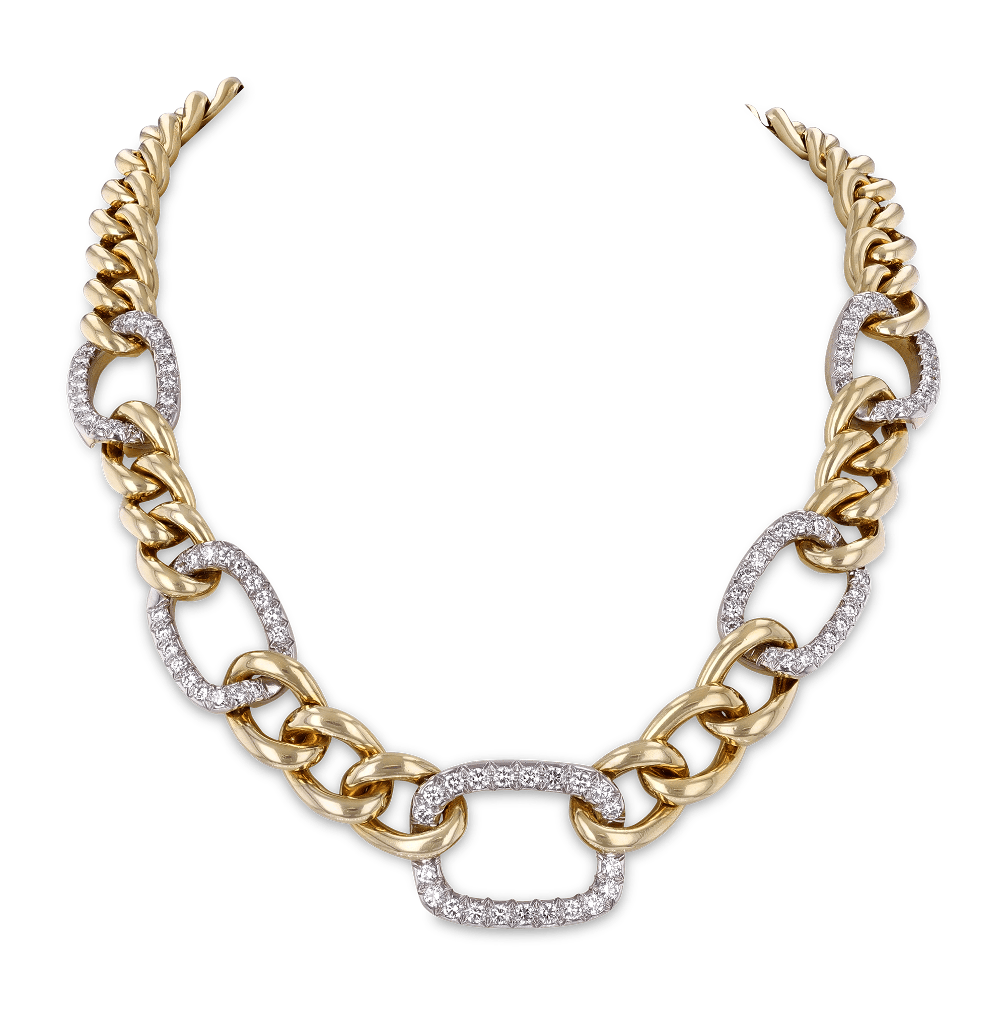 - Oversized curb links in rich 18K yellow gold alternate with platinum links