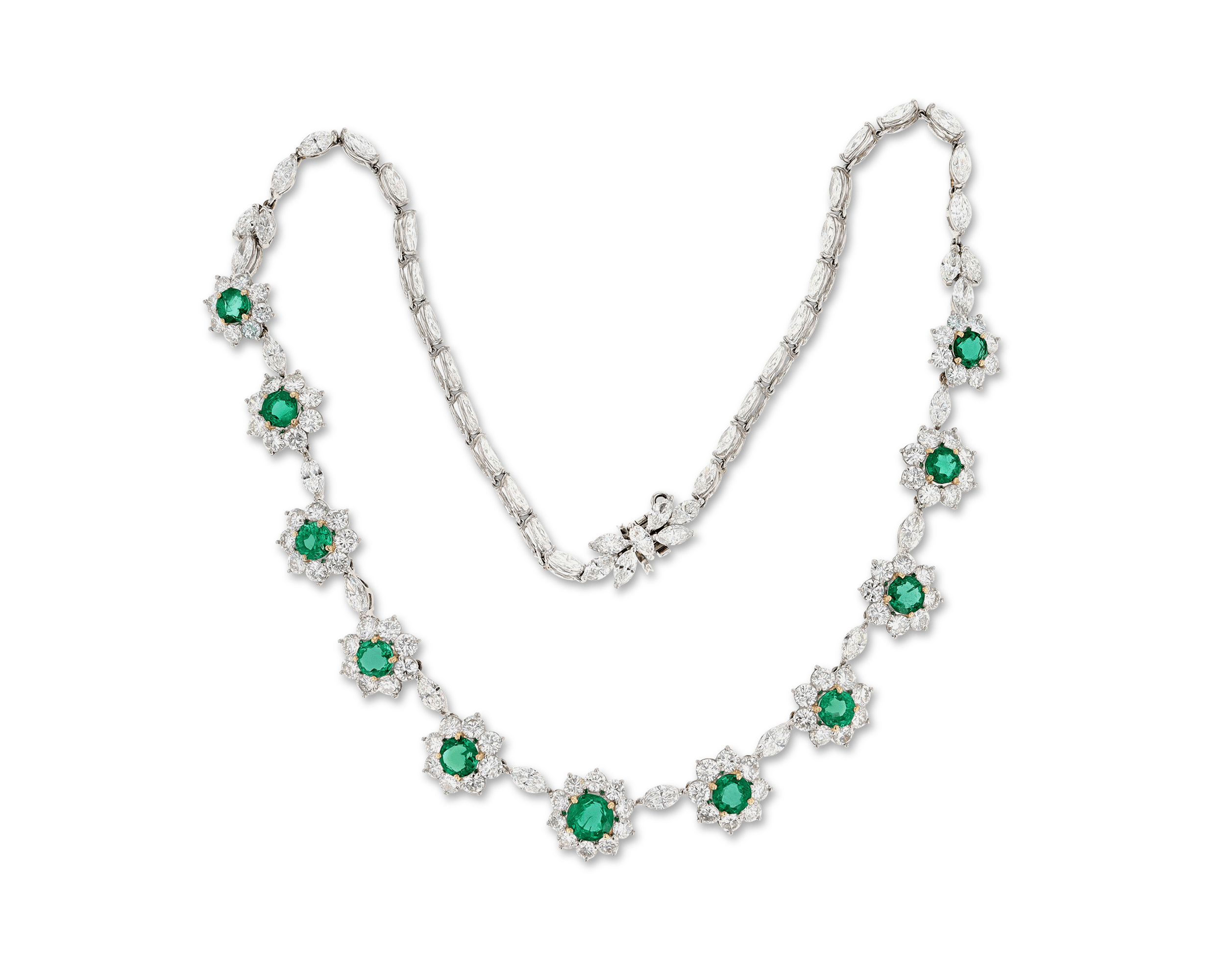 - Eleven expertly matched emeralds totaling 8.49 carats are set in this floral necklace