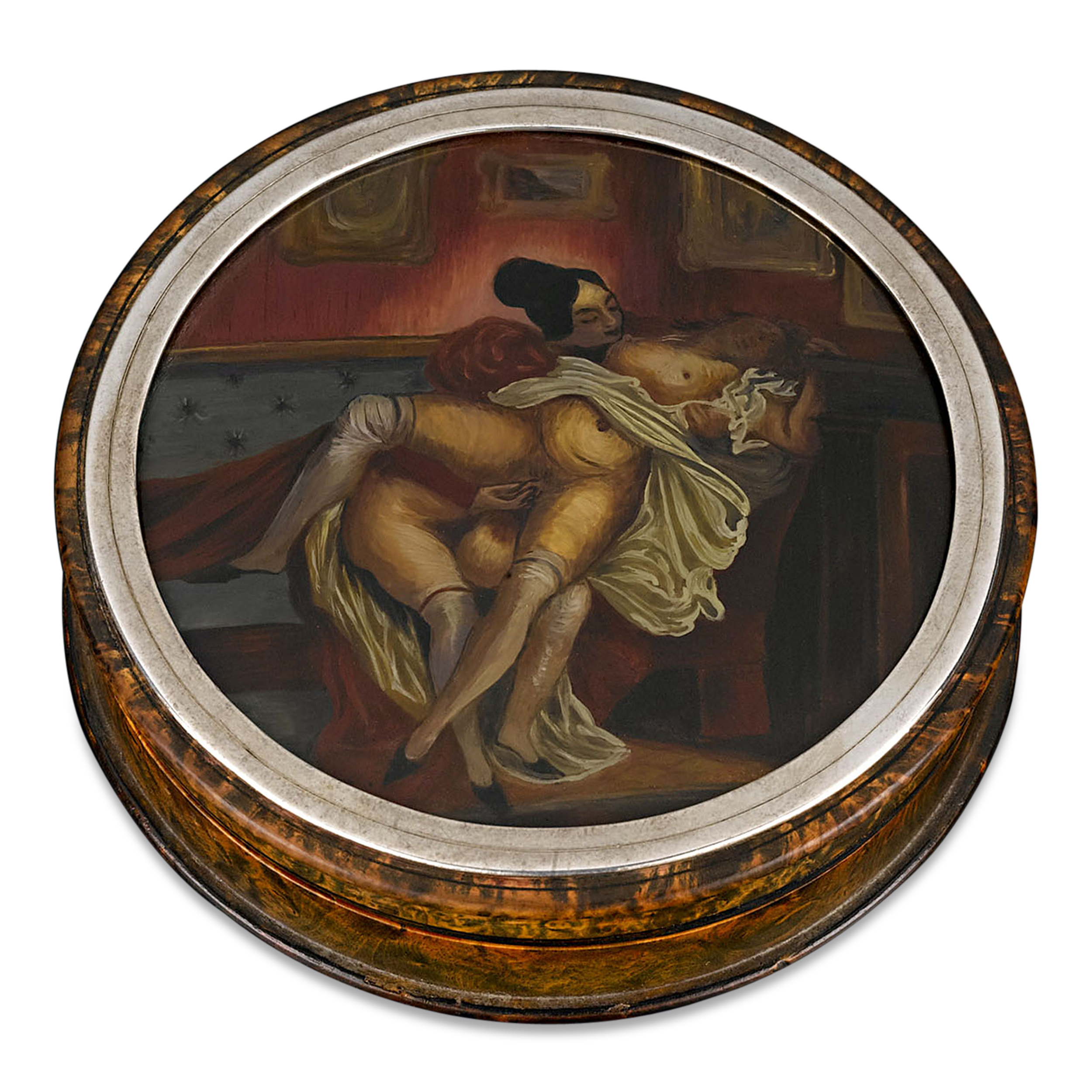 - This rare burlwood and tortoiseshell snuffbox features an erotic Sapphic scene on its cover