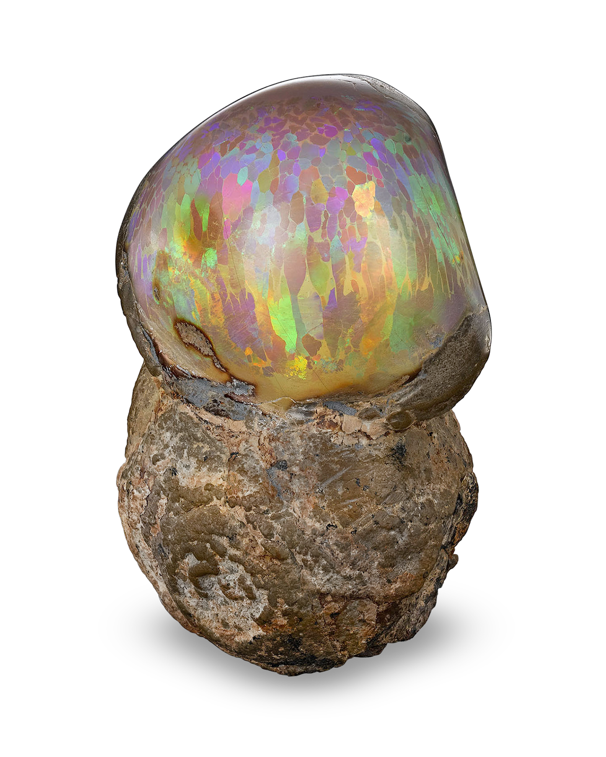 Once used by early man as tools, Ethiopian opals have only begun to be mined in the 1990s. Usually found in a round nodular form within a 3 meter thick layer of welded volcanic ash, these opals are plentiful, yet only about 1% of these nodules contain any color at all, let along the striking diversity of color that this piece exhibits. These amazing gems are so new to the market, yet they are gaining in popularity at an exponential rate. To find one of such large size and exquisite beauty is a rare treasure.