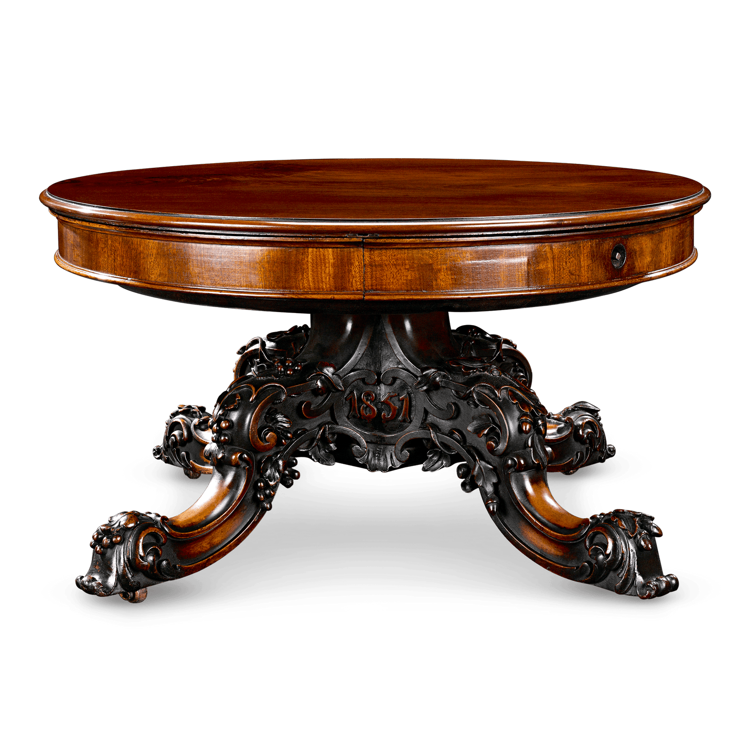 Carved with the year of the Exhibition on the beautifully designed pedestal base, the table is a testament to the significance of this innovation. The model is mentioned in detail in the catalog of the Great Exhibition of 1851, the first international exhibition of industry, manufacturing, and science. Held at London’s dazzling Crystal Palace, its visitors were treated to exhibits from around the globe, including feats of engineering, innovations in industry, and marvels of design. Queen Victoria herself was a frequent visitor, along with her husband, Prince Albert, and others including Charlotte Brontë, Lewis Carroll, Charles Darwin, Alfred Tennyson and Charles Dickens.