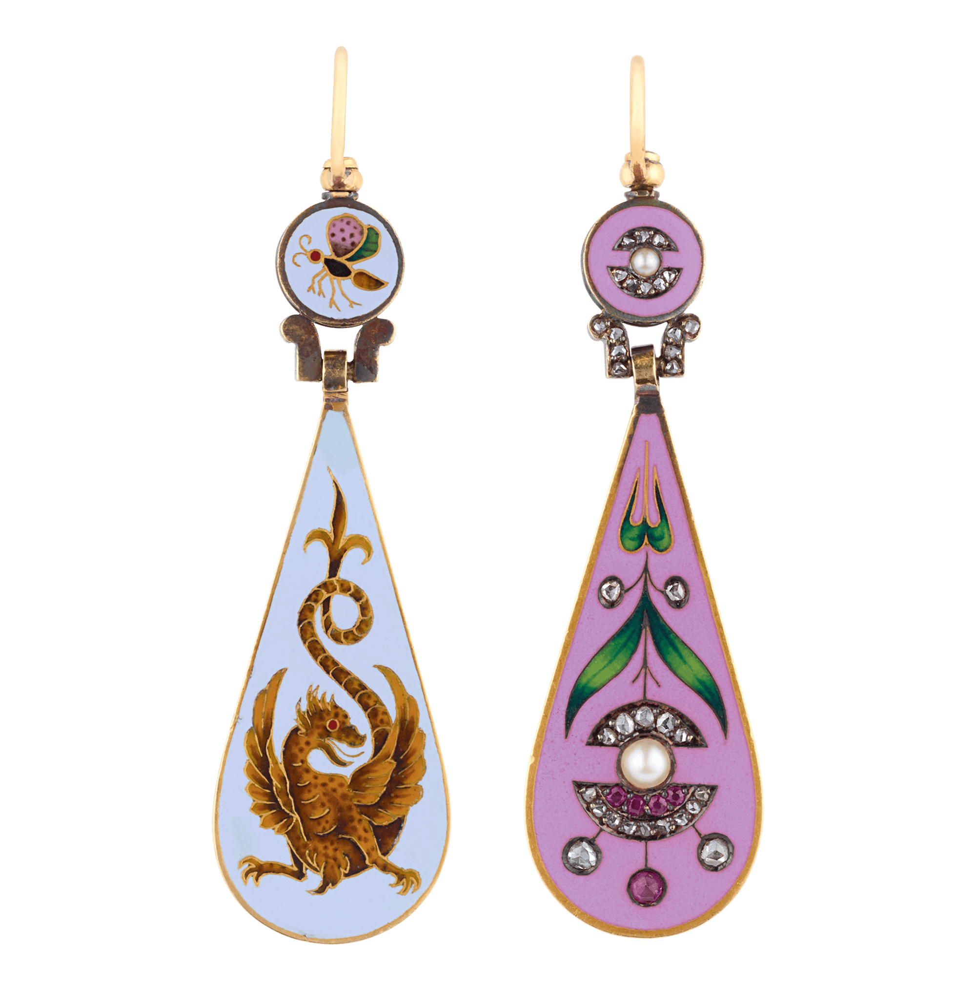 Crafted by the renowned 19th-century French jeweler Alexis Falize, these exquisite earrings are a rare testament to his mastery of cloisonné enamel. With an ingenious reversible design and vibrant hues, each earring features a fantastical Renaissance-style griffin on one side and a sparkling thistle on the other. The exquisite wire work is rendered in 18K yellow gold, and the opulent design is accented with ornamental seed pearls, rose cut diamonds and old cut rubies. Still. . .