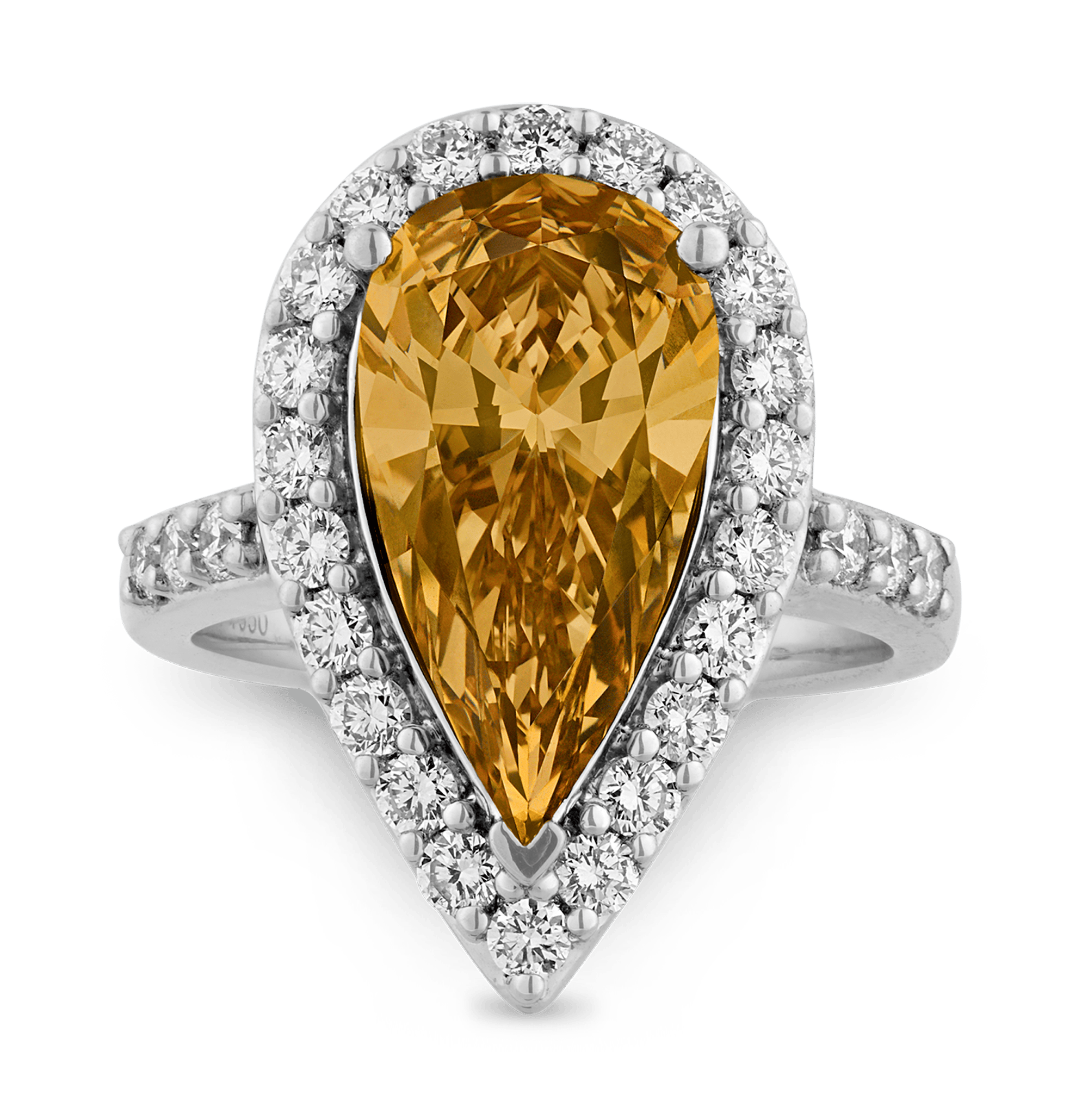 - A perfect marriage of brown and yellow hues, the pear shaped, brilliant cut stone weighs 4.00 carats