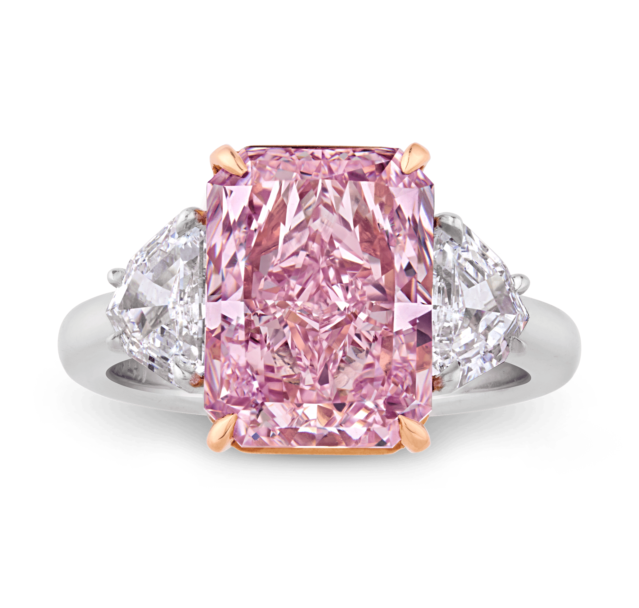 Natural pink diamonds exceeding five carats are among the rarest gemstones on Earth, and those displaying the purple modifier—as seen in this remarkable specimen—possess cooler undertones and greater chromatic depth that enhance the stone's mesmerizing beauty. Flanked by two shield-shaped white diamonds totaling approximately 2.00 carats, the center stone is set in platinum with 18K rose gold accents that complement its extraordinary hue.