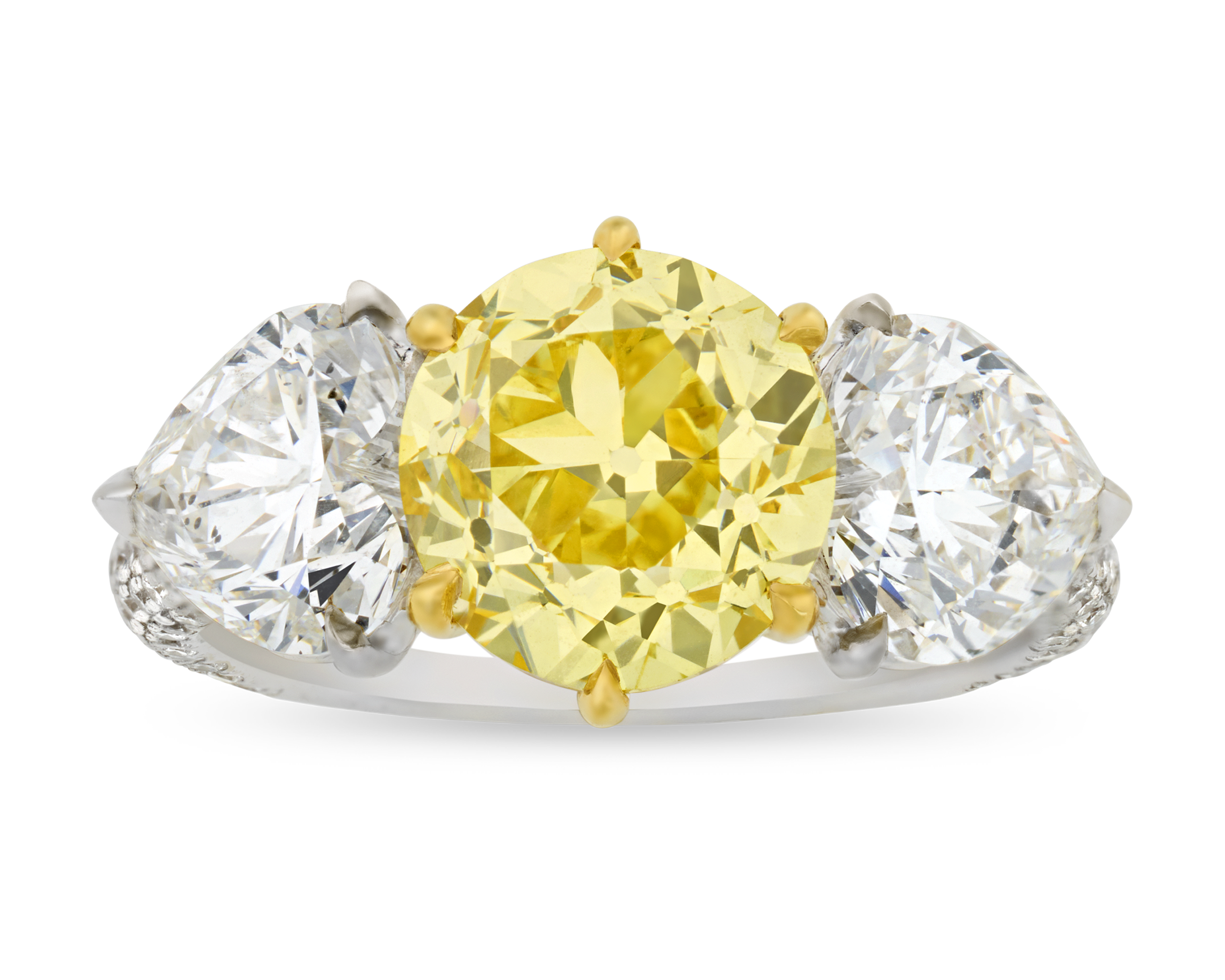 - Featuring a sunshiny hue, this ring showcases a glittering Old European-cut yellow diamond