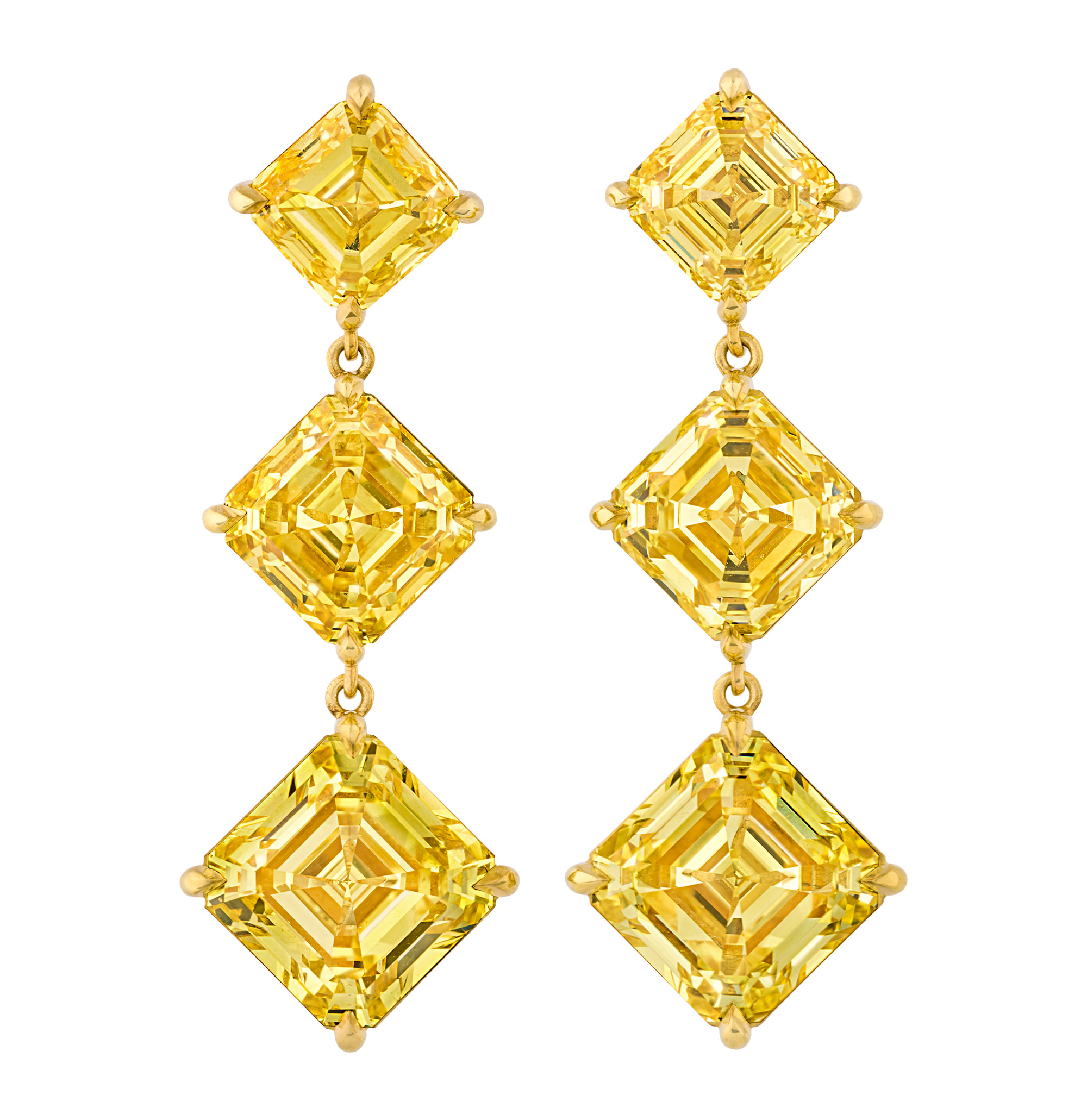 - These earrings feature six precisely matched Fancy Vivid Yellow diamonds totaling 21.20 carats