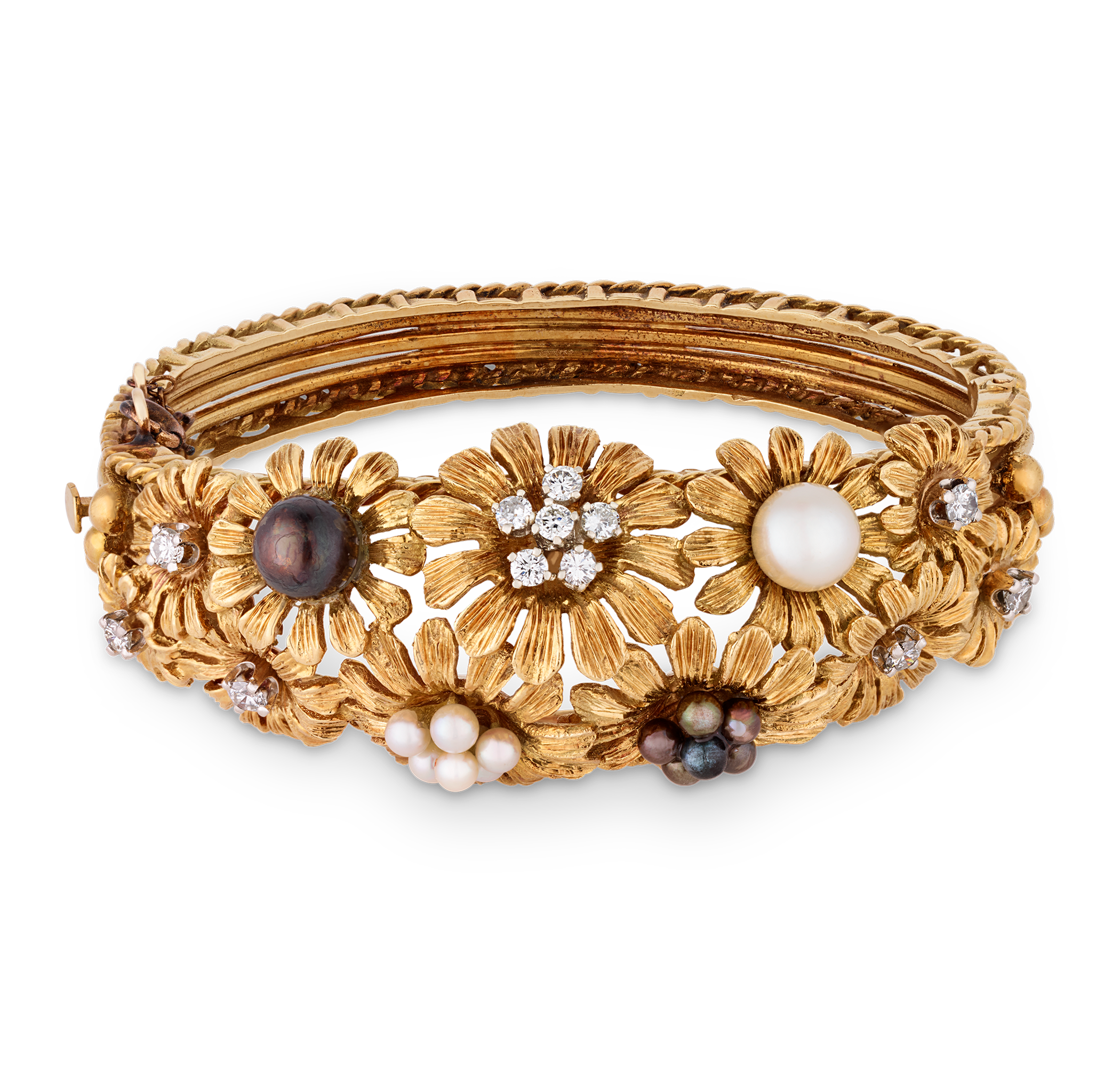 - This intricately designed bracelet features lifelike floral motifs in 18K yellow gold