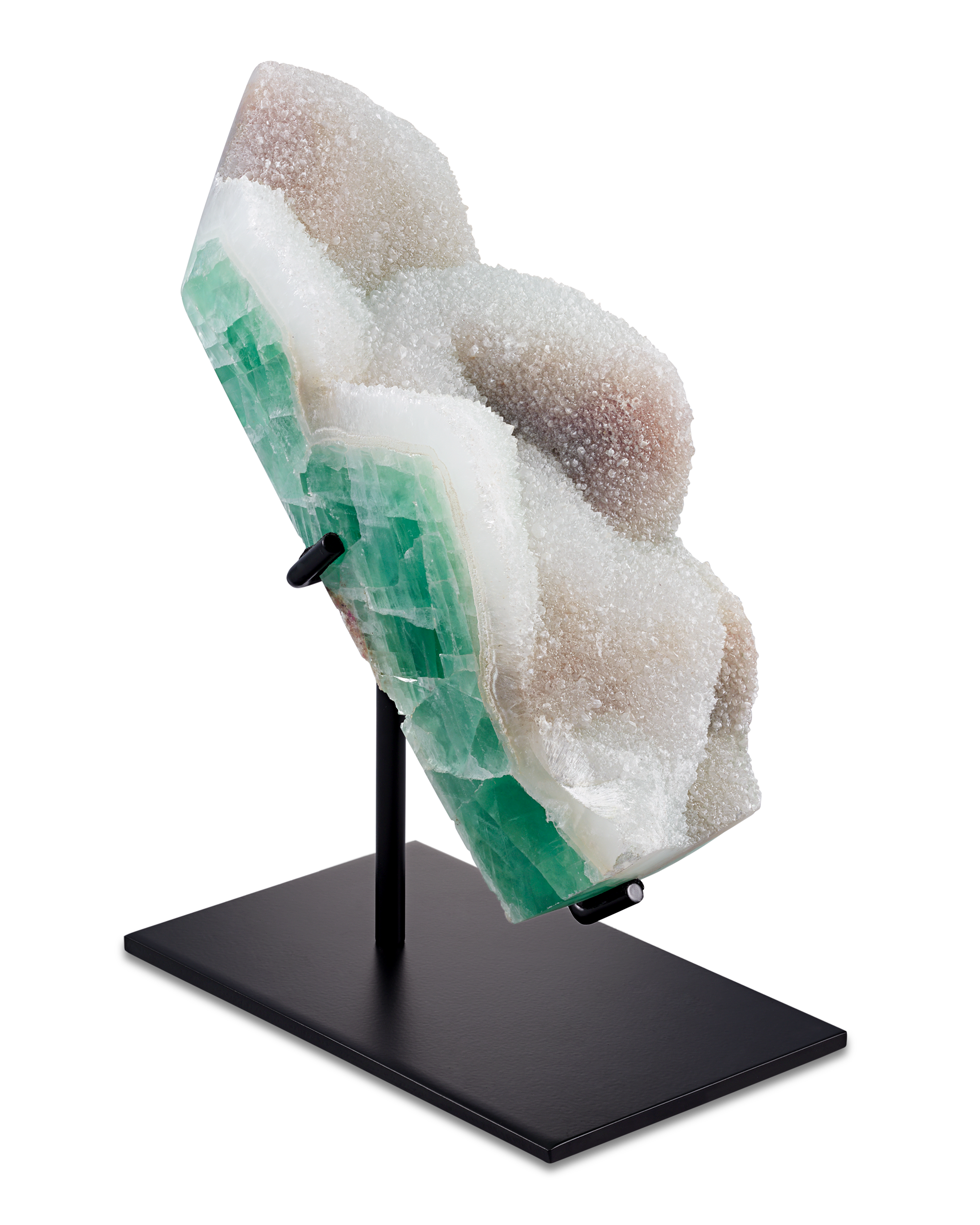 This museum-quality green fluorite crystal rises like a snow-capped mountain. Standing an impressive 11 1/2" high, the striking crystal tower highlights the mineral’s natural clarity and sculptural beauty. A unique specimen, it exemplifies both geological interest and decorative elegance. Complete with its metal base for display.