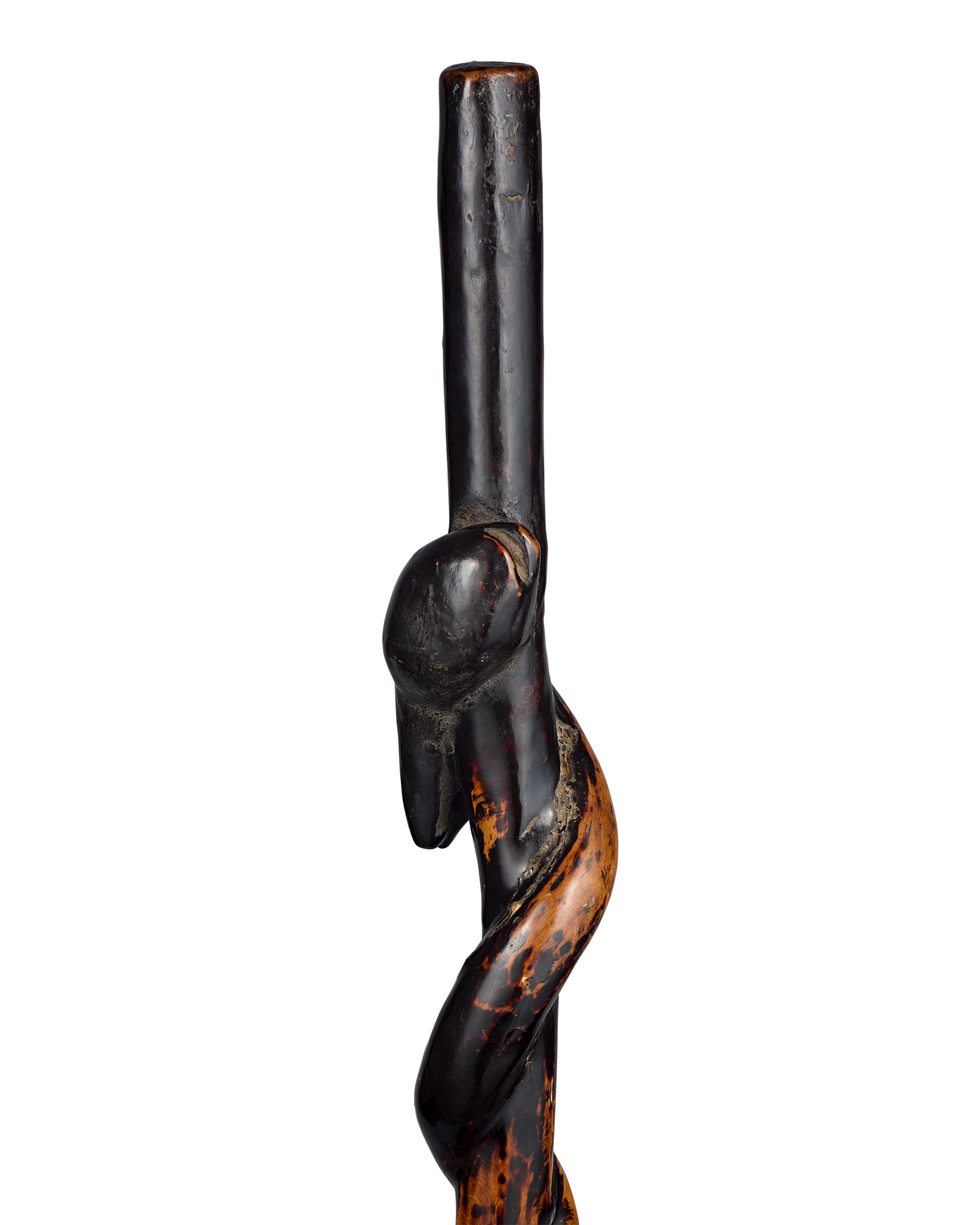 Carved from bramble wood and finished with deep black, this nineteenth-century French folk art cane preserves the material’s naturally twisting growth, resulting in a strikingly sculptural form. The maker allowed the wood’s organic movement to dictate the cane’s sinuous silhouette, creating an object that balances utility with expressive craftsmanship.