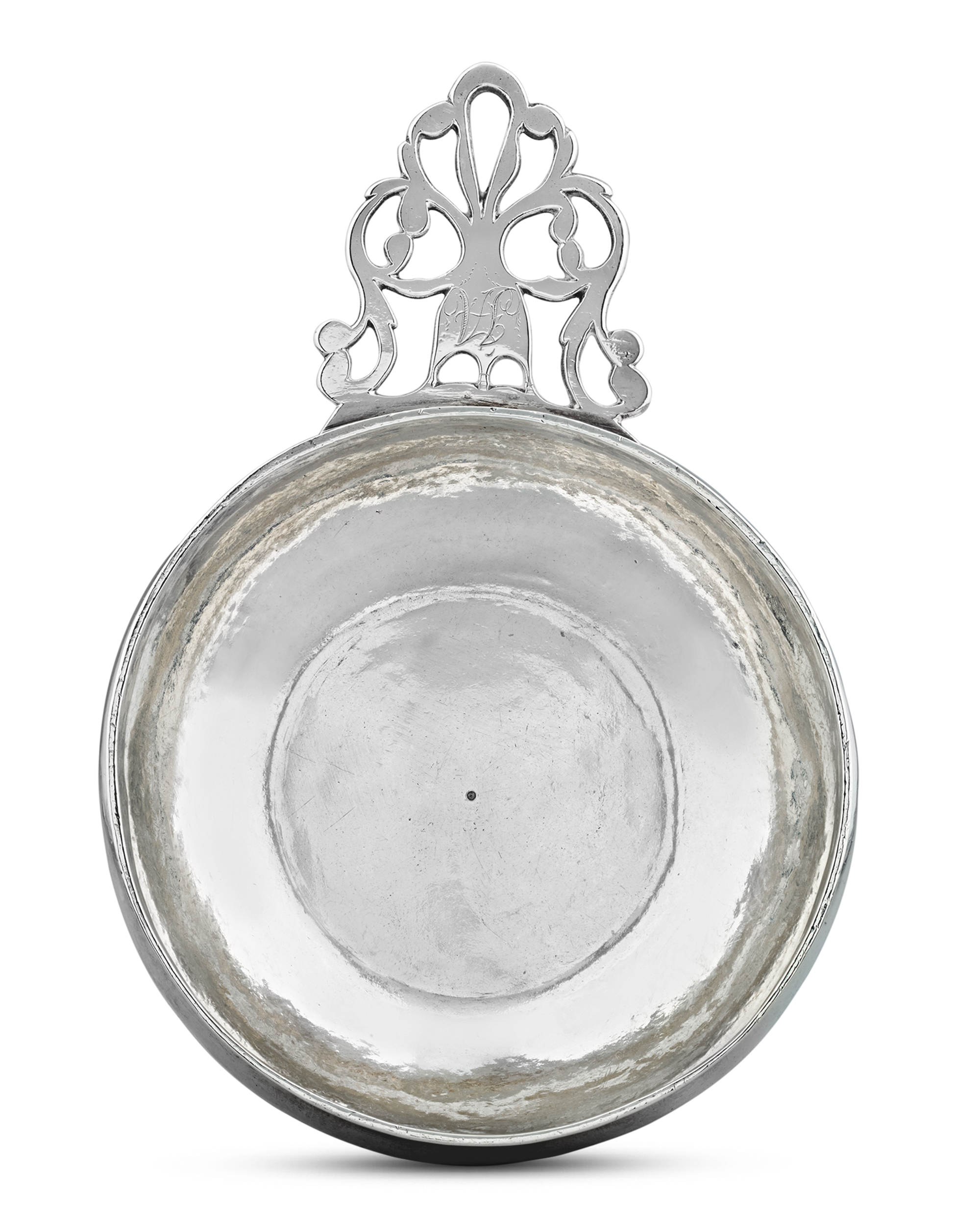 This exceptional silver porringer, or bleeding bowl, epitomizes both functional and aesthetic Georgian craftsmanship. The round bowl features an inset rim and a gracefully applied, pierced handle adorned with a scrolling motif. Historically, such shallow bowls with a single, flat handle were known interchangeably as bleeding bowls or porringers on both sides of the Atlantic. They were used for measuring and serving food, with pewter versions also widely used.. . .