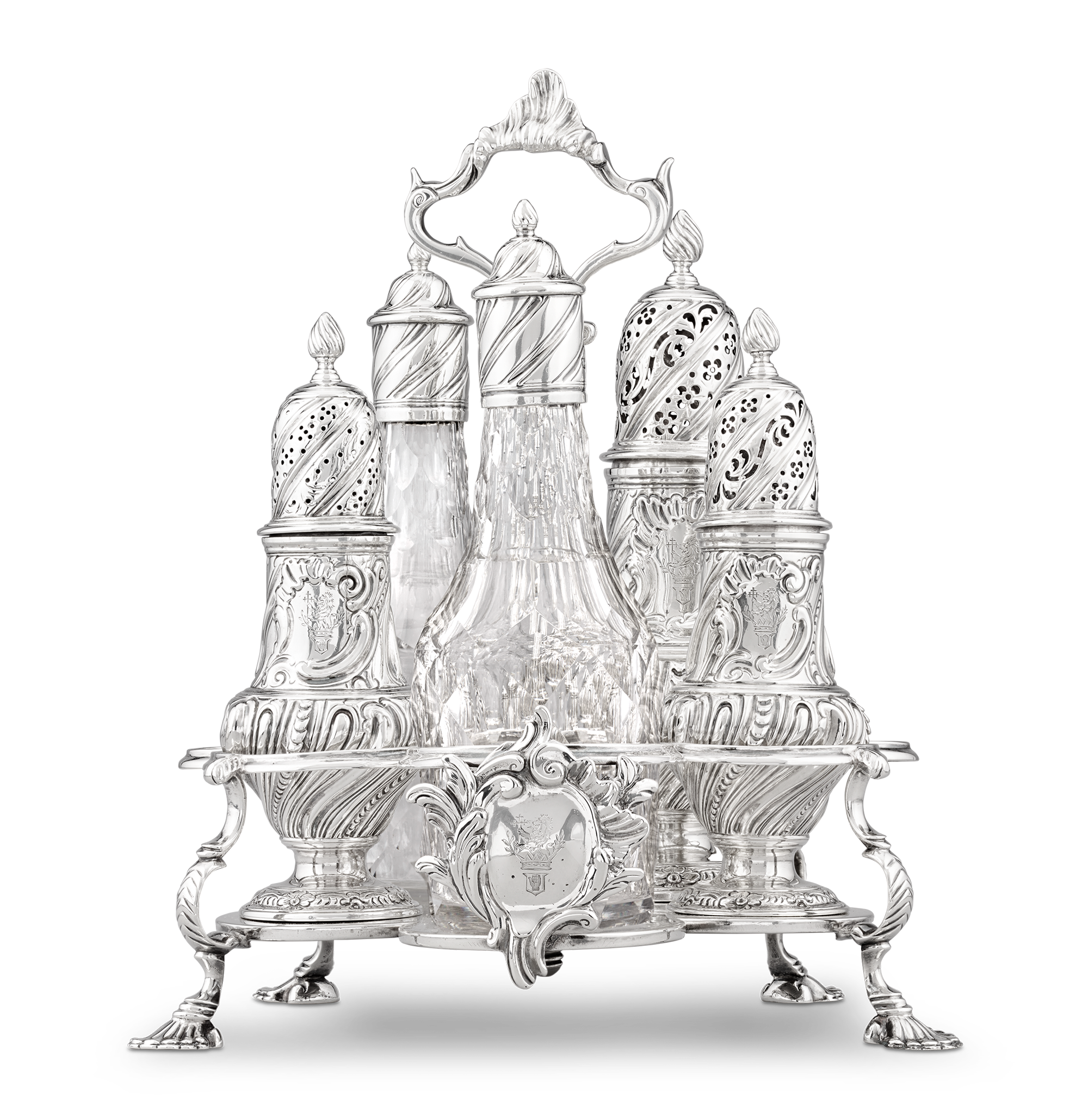 A superb example of mid-18th-century English silver, this Warwick cruet by Samuel Wood showcases the elegance and refinement of Georgian tableware. The cinquefoil frame rests gracefully on five shell feet, supporting a baluster stem with a scroll handle and an applied rococo cartouche at the front. The cruet holds two cut-glass bottles for oil and vinegar and three spiral-chased silver casters for salt, pepper and mustard, each fitted with silver covers engraved with a heraldic coat-of-arms. The design is thoroughly Rococo, with its elegant scrolls, asymmetrical curves and intricate detailing throughout the frame, baluster stem and casters.