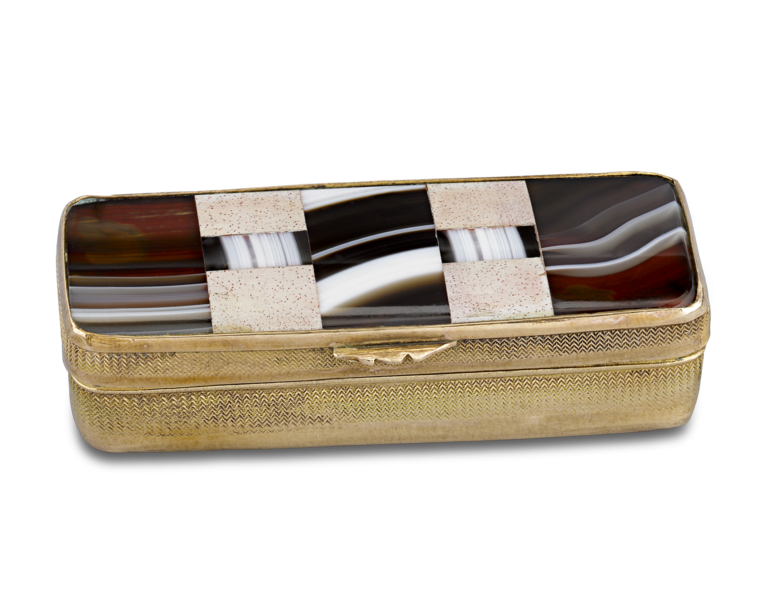 - Contrasting specimens of richly veined agate adorn this chased gold snuff box