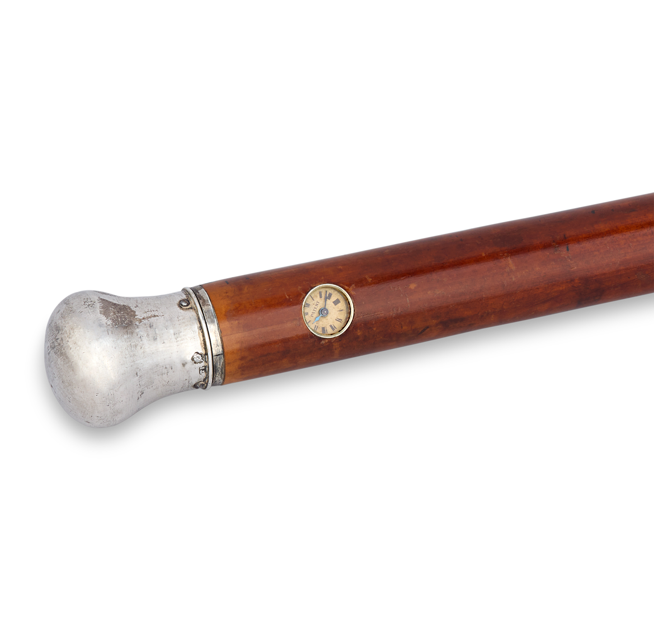 This sleek Austrian watch cane, attributed to Holuska and dating to circa 1885, exemplifies the union of horology and gentleman’s accessories that flourished in late 19th-century Europe. The refined silver handle is paired perfectly with a circular watch dial inset into the shaft, its time adjusted by a winder at the rear. The slim shaft of the cane terminates in a nickel ferrule.
