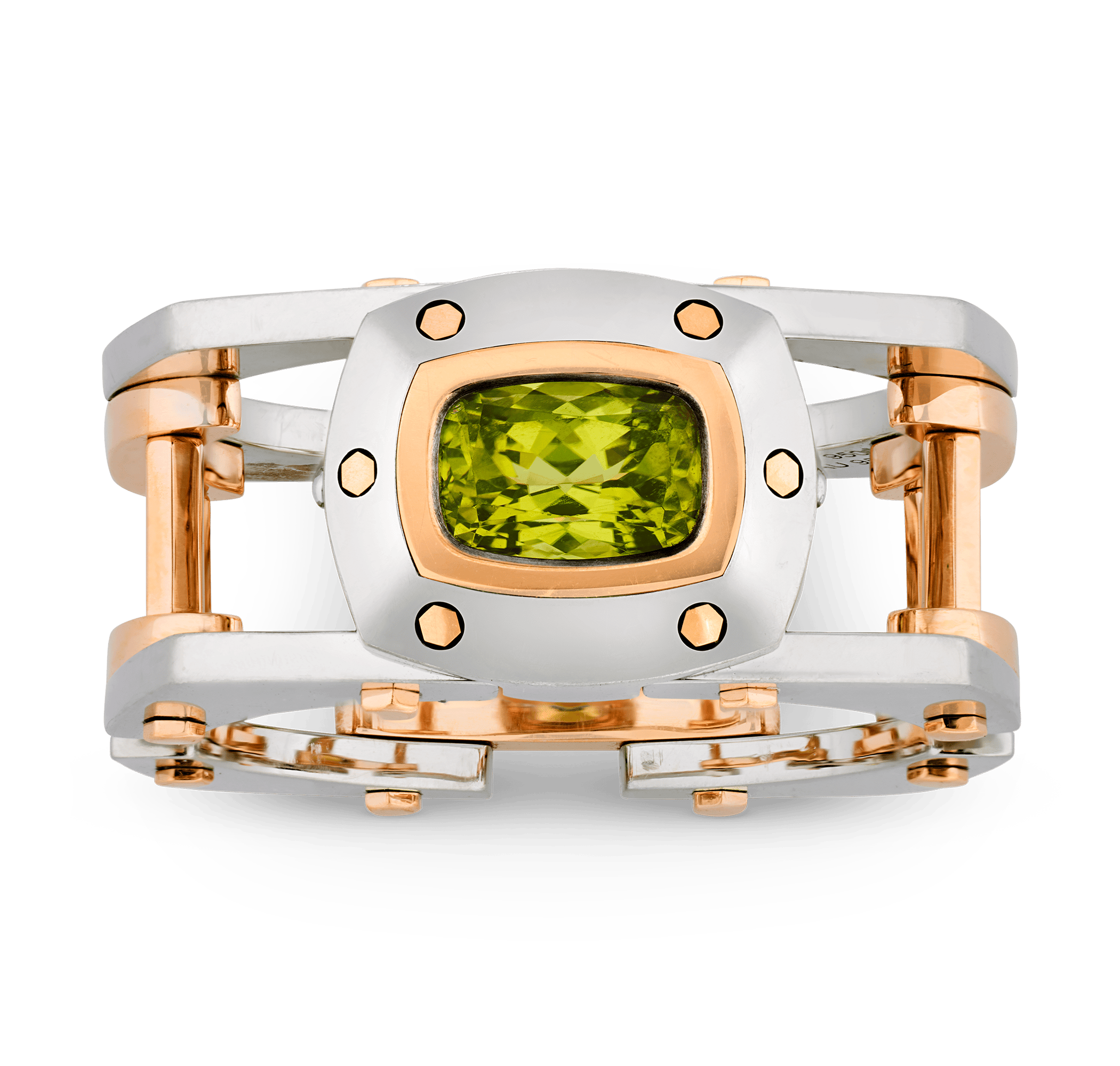- The intense yellowish green gemstone is set in an Art Deco-style ring of platinum and 23K rose gold