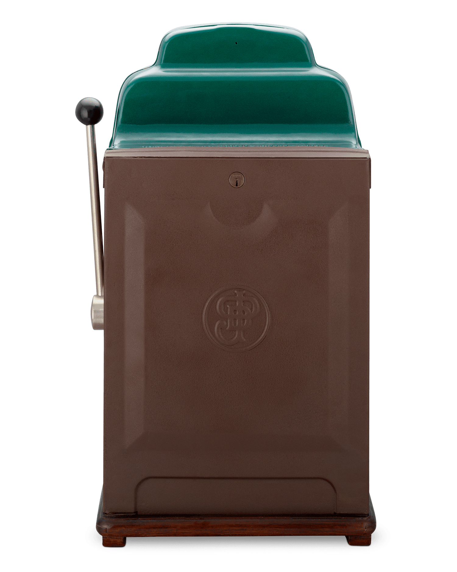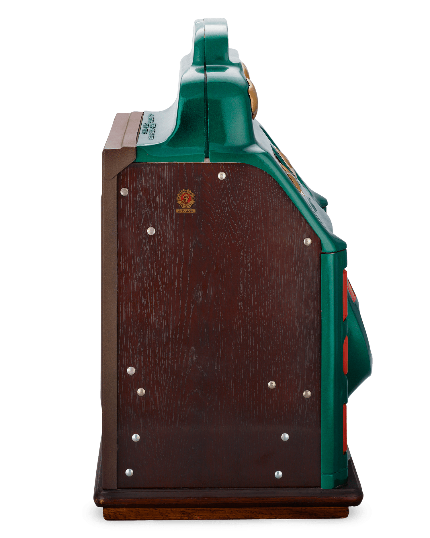 This Club Chief 25-cent slot machine is a nostalgic artifact of postwar Americana, first manufactured in 1946 by O.D. Jennings & Company of Chicago. Part of the renowned Chief line first introduced during World War II, this model is celebrated for its exceptional mechanical integrity and bold patriotic styling. Today, it stands as a rare and highly collectible piece of American gaming history. With its flashy green and red finish, detailed castings and signature Native American motif, this slot machine embodies the craftsmanship and visual flair that made Jennings the top producer of slot machines in the US in the mid-century.