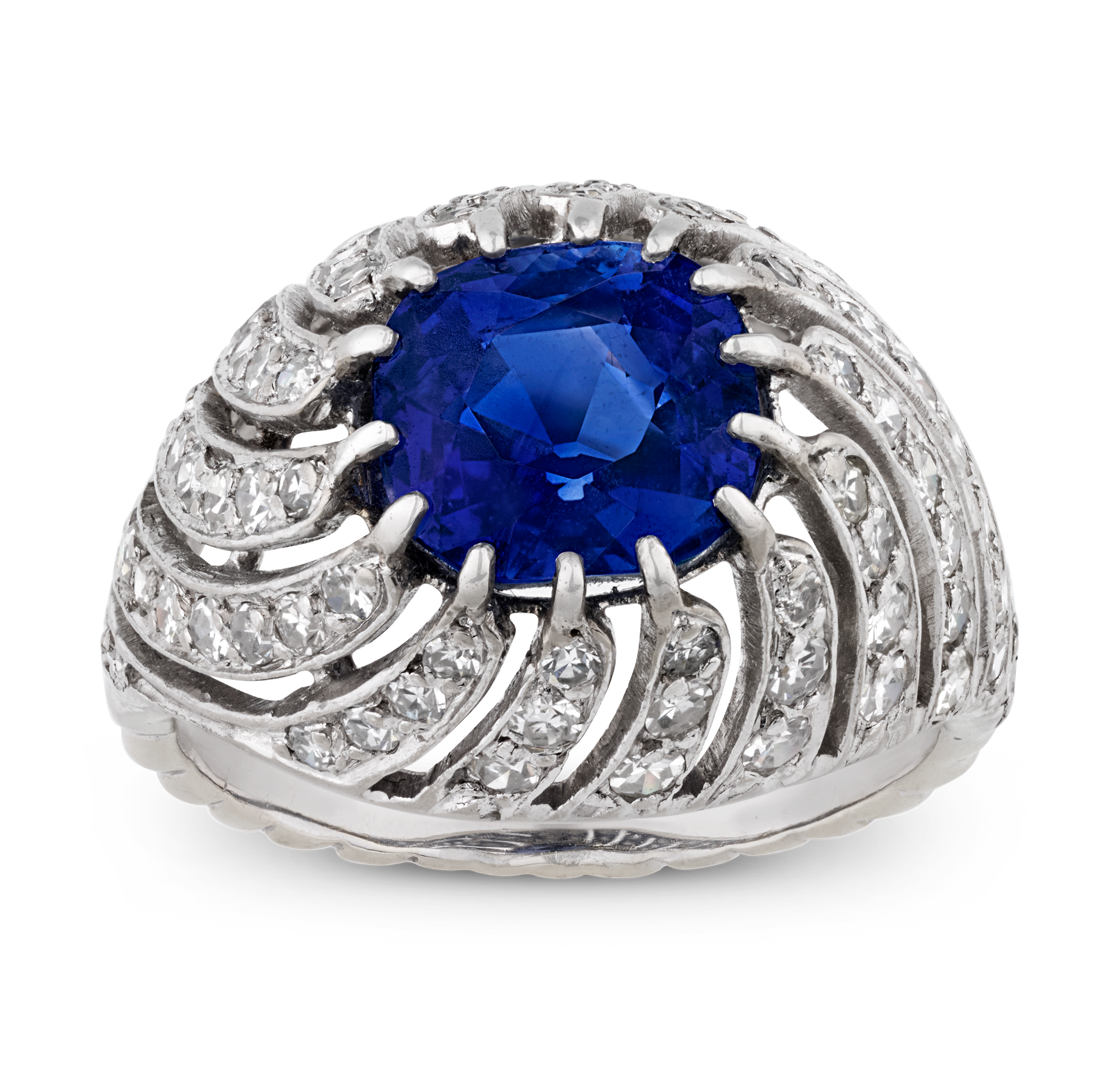 - A striking Kashmir sapphire of 3.53 carats takes center stage in this bombé ring
