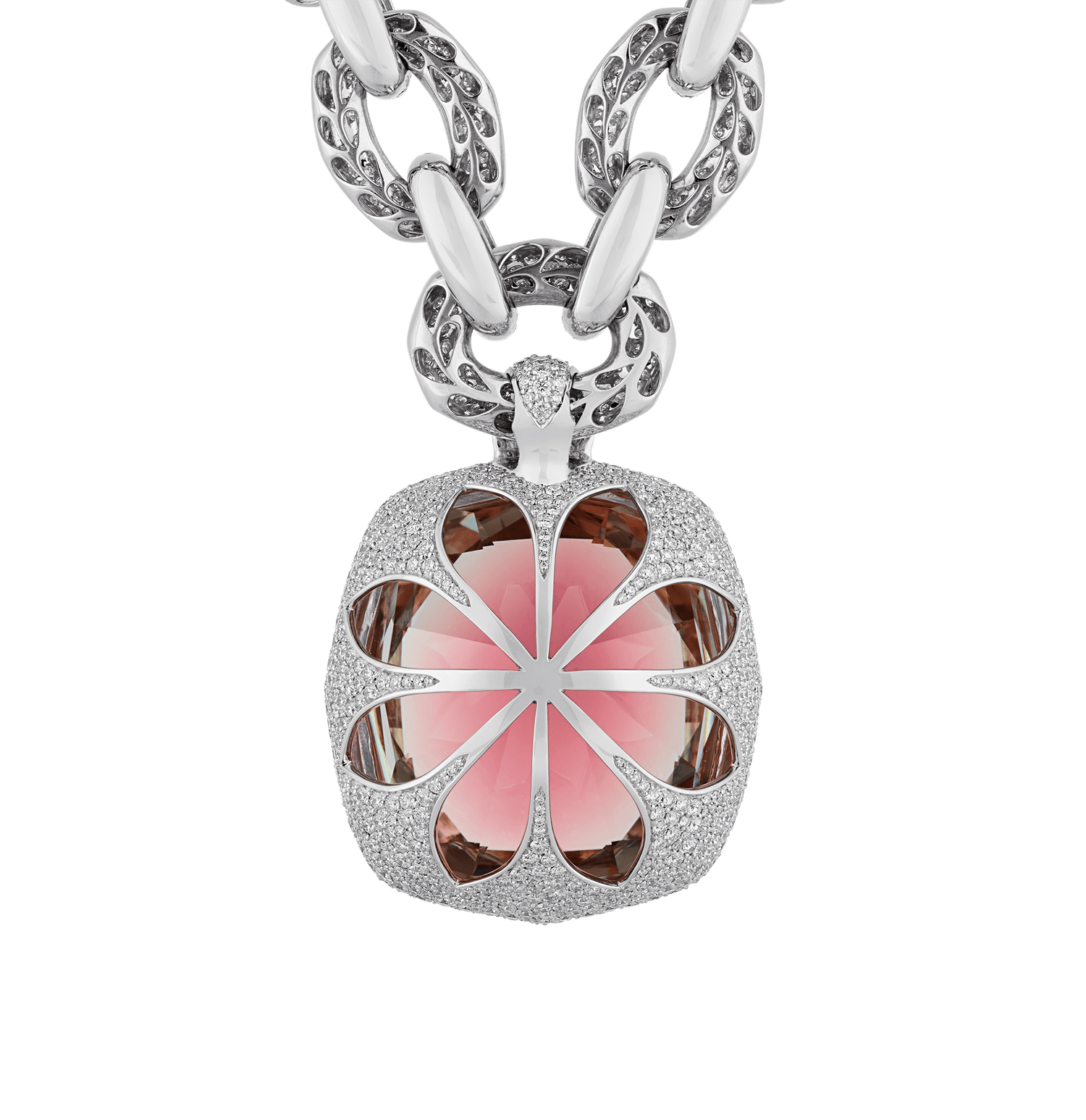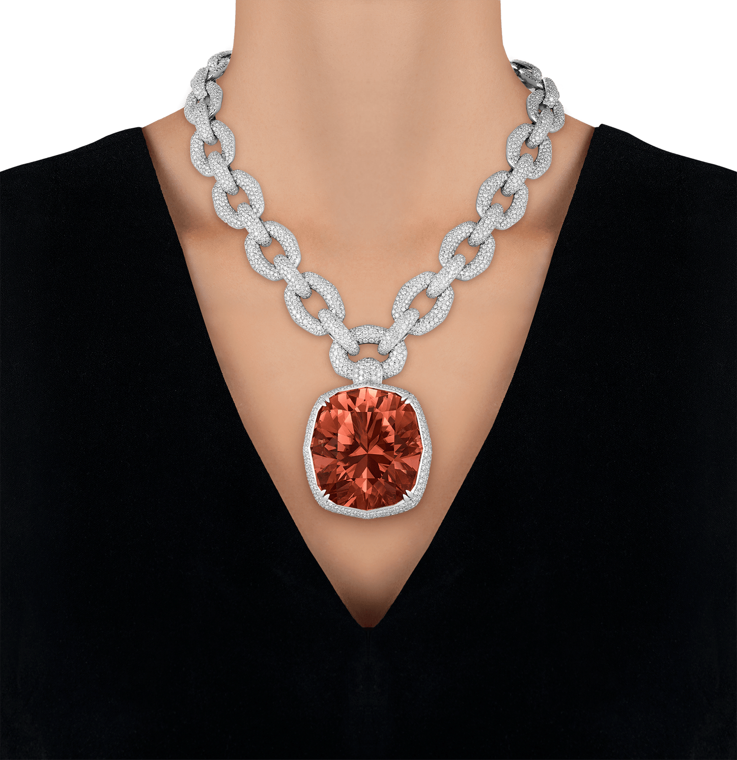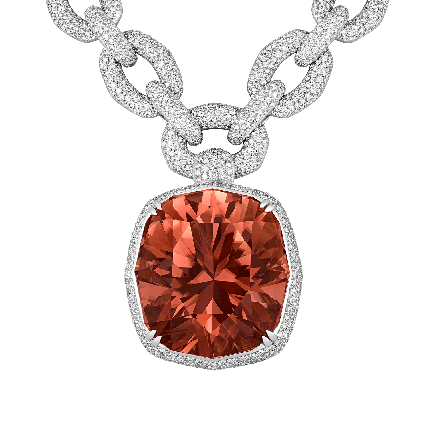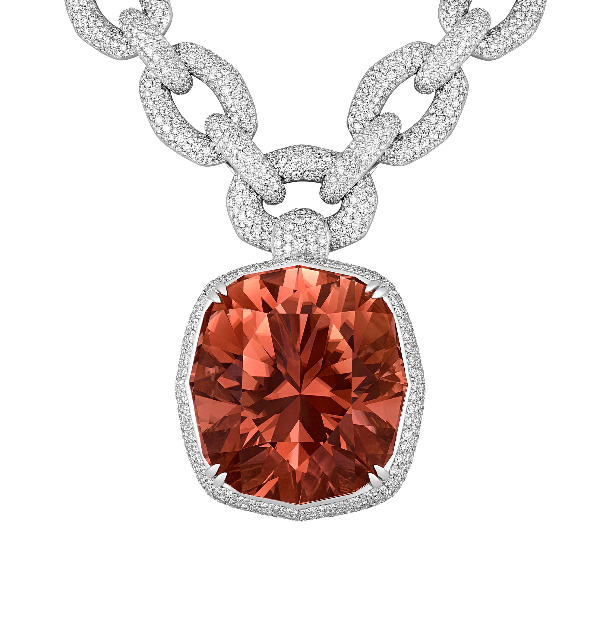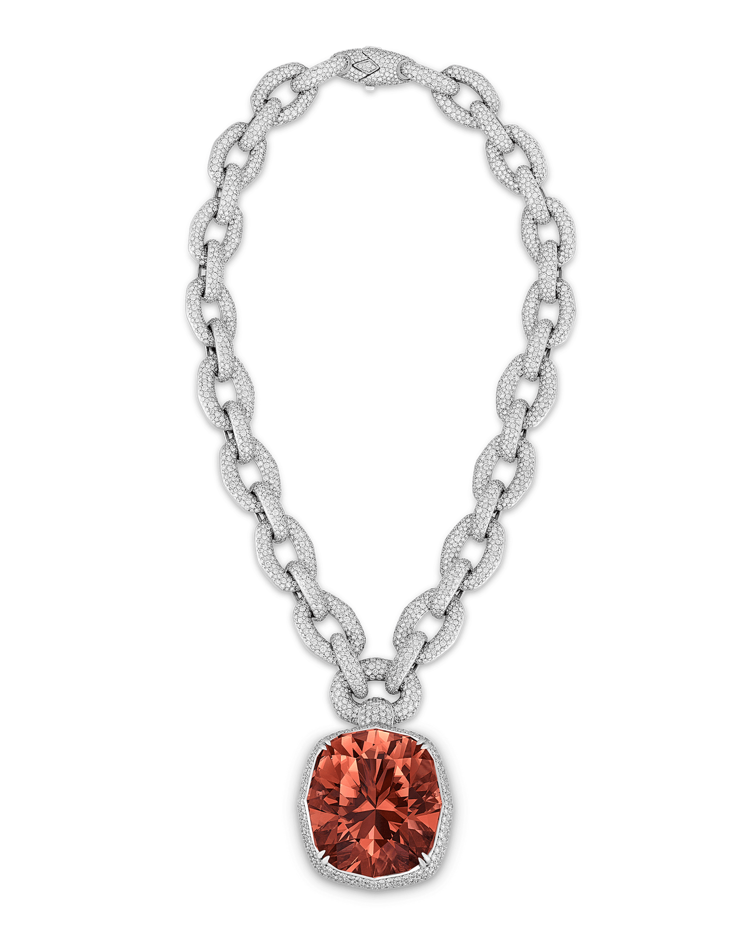 The pendant is suspended from an opulent chain composed of oval links meticulously pavé-set with flawless D-color diamonds totaling 40.23 carats. Each link in the 18K white gold setting has been crafted to maximize brilliance, creating a striking contrast with the vibrant red of the centerpiece tourmaline.