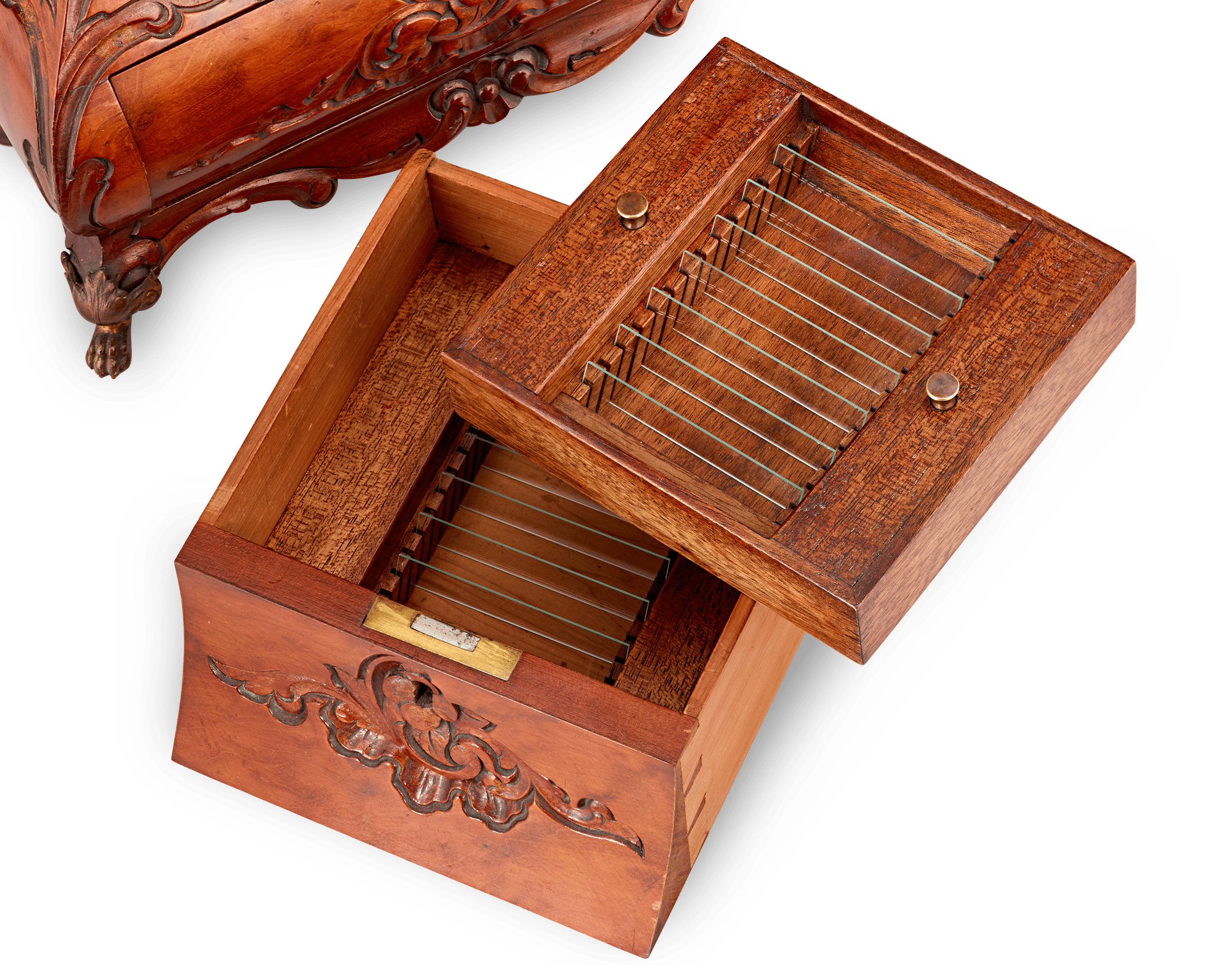 - The tool stands on its intricately carved wooden base with a slide drawer and an accessory drawer