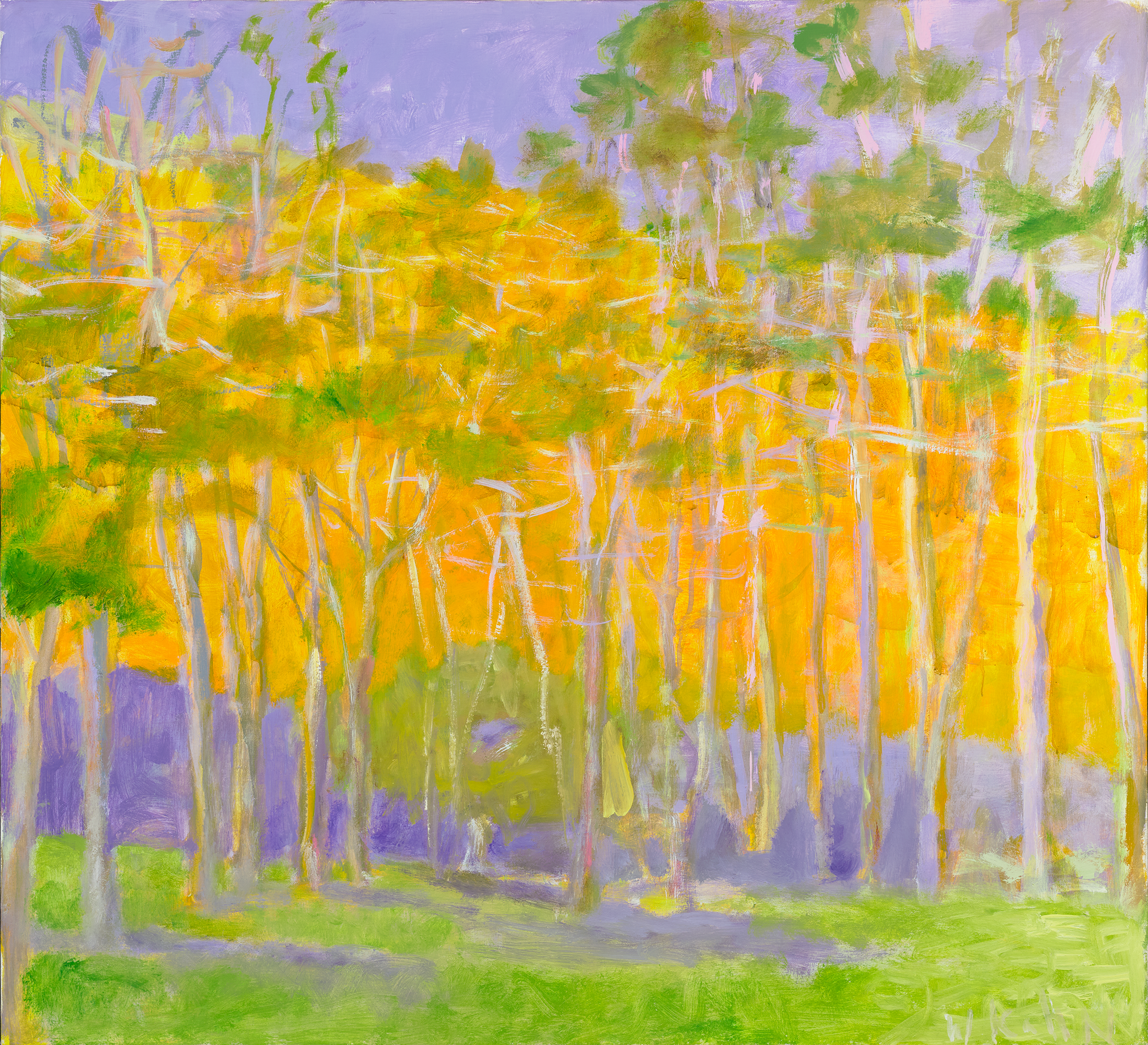The composition reveals a forest interior rendered in Kahn’s signature palette of radiant purples, oranges and greens, suffused with vibrant golden light filtering through the trees. His characteristic “foggy” effect is fully realized, as warm sunlight permeates the canopy and settles into soft violet shadows.