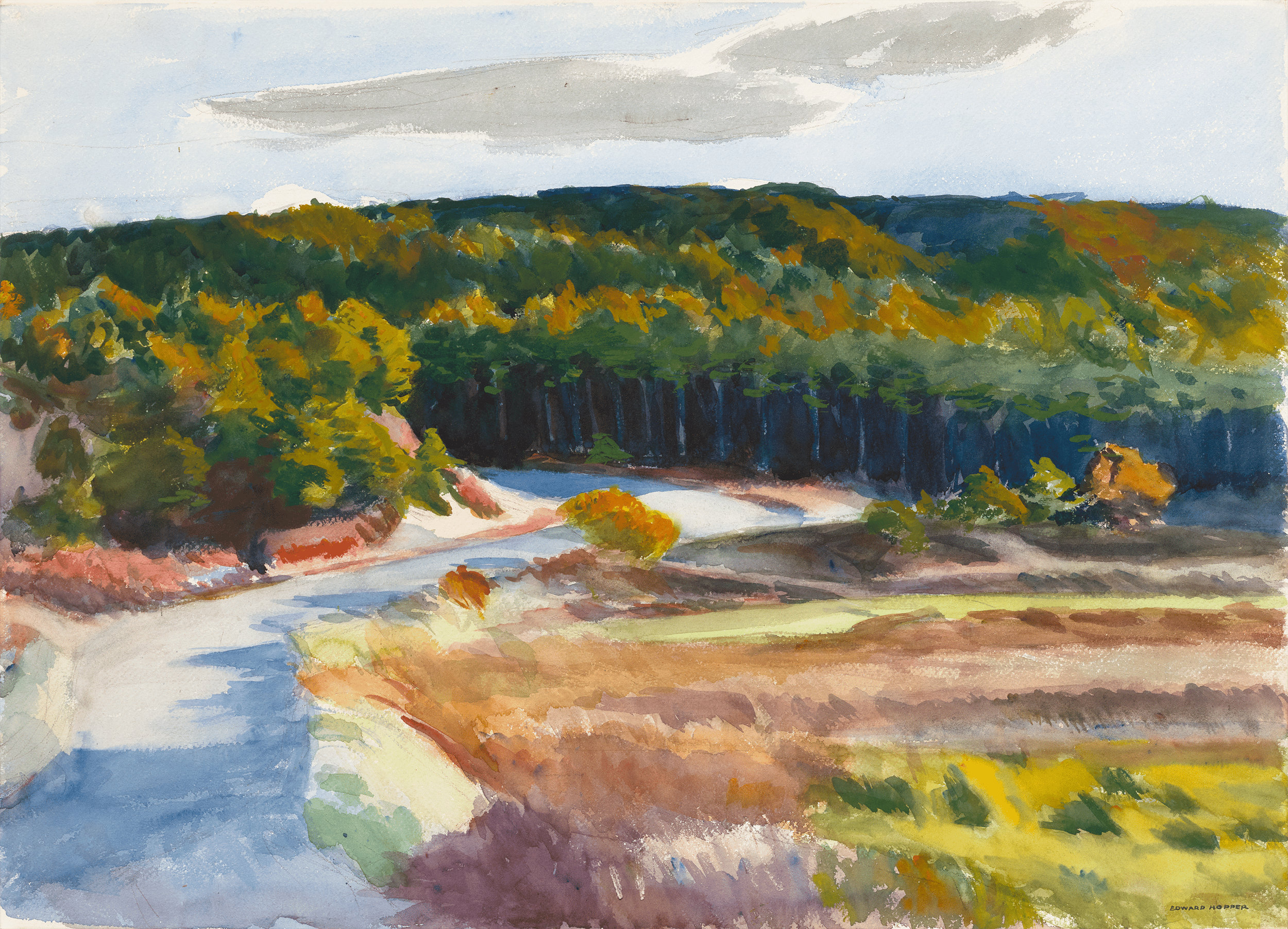 The work exemplifies Hopper’s exceptional talent for the challenging medium of watercolor. Layers of delicately applied hues capture the iconic brilliance of fall in New England. In his official ledger, Hopper included a sketch and noted its “vivid color” and “blue sky with grey bird cloud,” showing that he recognized this scene as one of remarkable intensity. A winding road anchors the composition, vanishing into a dramatic band of trees and drawing the viewer inward with the quiet mystery that is quintessential Hopper.