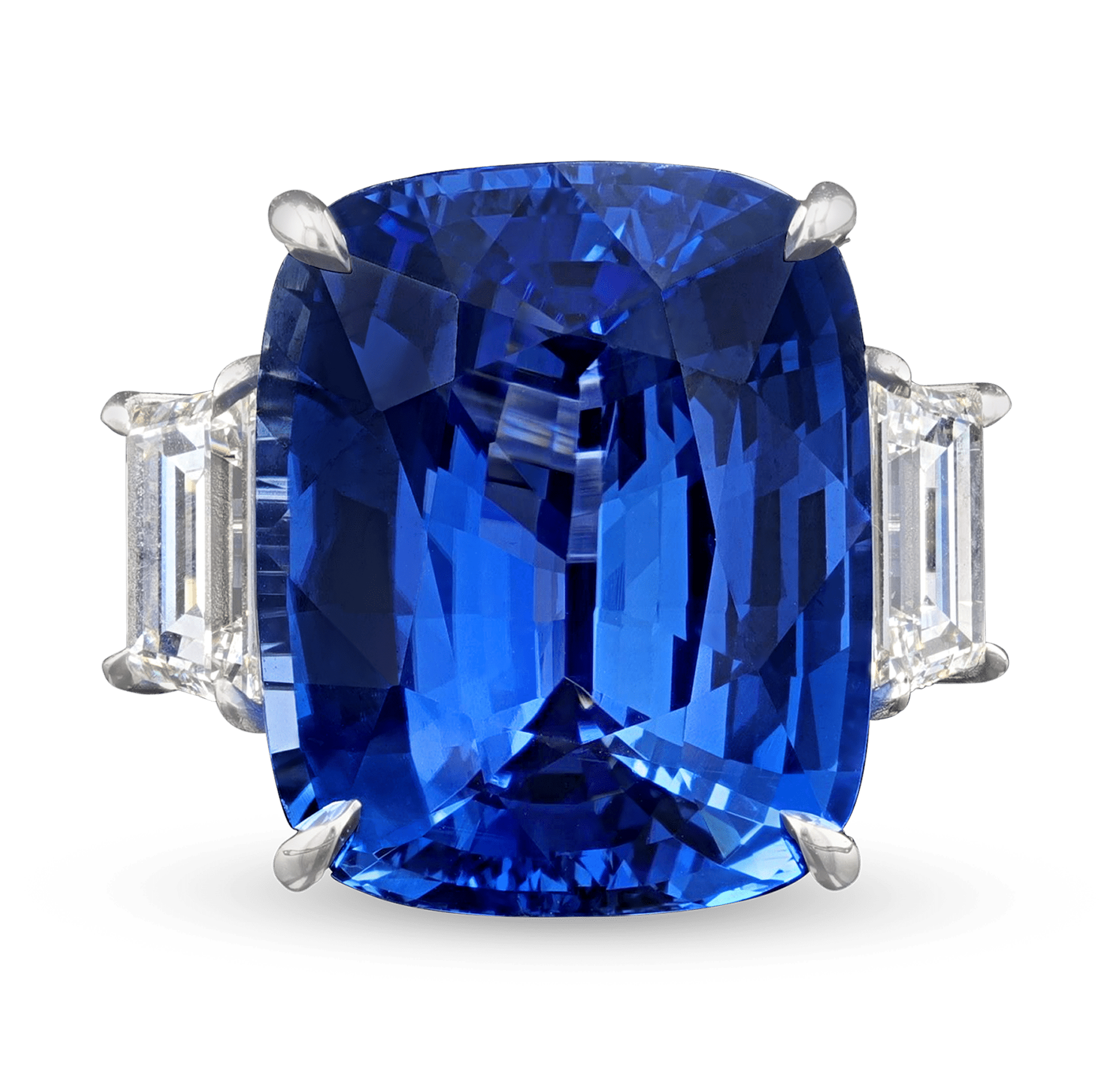 - The sapphire is flanked by two diamonds totaling 2.56 carats